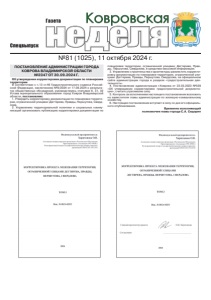 66 №81 11 октября 2024 г. ПОСТАНОВЛЕНИЕ АДМИНИСТРАЦИИ ГОРОДА КОВРОВА ВЛАДИМИРСКОЙ ОБЛАСТИ №2345 ОТ 30.09.2024 Г. Об утверждении корректировки документации по планировке территории На основании постановления администрации г.Коврова от 23.08.2024 №2022 «Об отклонении документации по планировке территории», в соответствии с заключением №6/2024 о результатах общественных обсуждений отклонена и направлена на доработку корректировка документации по планировке территории в районе улицы Тургенева. На основании заявления ООО СЗ «Тимбер Строй» от 28.08.2024 рег. №5173/01-34, решения комиссии по землепользованию и застройке г.Коврова от 16.09.2024 (протокол №26, п.4), учитывая устранение замечаний, в соответствии с ч.13 ст.46 Градостроительного кодекса Российской Федерации, руководствуясь статьями 6, 31, 32 Устава муниципального образования город Ковров Владимирской области, постановляю: 1. Утвердить корректировку документации по планировке территории в районе улицы Тургенева. 2. Управлению территориальной политики и социальных коммуникаций организовать публикацию корректировки документации по планировке территории в районе улицы Тургенева в средствах массовой информации. 3. Управлению строительства и архитектуры разместить корректировку документации по планировке территории в районе улицы Тургенева на официальном сайте администрации города в разделе «градостроительная деятельность». 4. Постановление администрации г.Коврова от 23.08.2024 №2022 «Об отклонении документации по планировке территории», постановление администрации г.Коврова от 25.06.2021 №1270 «Об утверждении документации по планировке территории» считать утратившими силу. 5. Контроль за исполнением настоящего постановления возложить на заместителя главы администрации по жилищно-коммунальному хозяйству. 6. Настоящее постановление вступает в силу со дня его официального опубликования. Временно исполняющий полномочия главы города С.А. Сидорин