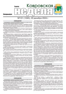 2 №101 20 декабря 2024 г. Место подачи (приема) заявок и документов: электронная площадка АО «Единая электронная торговая площадка» http://www.roseltorg. ru. 5. Дата, время и место определения участников: 22.01.2025 года в 11.00 часов в здании Администрации г. Коврова по адресу: ул. Краснознаменная, д. 6. 6. Проведение аукциона 24.01.2025 года в 11.00 часов на электронной торговой площадке АО «Единая электронная торговая площадка» http://www.roseltorg.ru. 7. Победителем признается участник, предложивший наибольшую годовую арендную плату за земельный участок. В случае, если заявку на участие в аукционе подало только одно лицо, признанное единственным участником аукциона, договор аренды земельного участка заключается с таким лицом по начальной цене предмета аукциона. Победитель аукциона или иное лицо, с которым заключается договор аренды земельного участка в соответствии с Земельным кодексом РФ, обязаны подписать договор аренды земельного участка в течение 30 дней со дня направления им такого договора. При уклонении или отказе победителя аукциона, либо лица, признанного единственным участником аукциона, от заключения в установленный срок договора аренды земельного участка задаток ему не возвращается, и он утрачивает право на заключение указанного договора. 8. Осмотр земельного участка претендентом осуществляется самостоятельно. С иными сведениями, в т.ч. формой заявки об участии в торгах, планом земельного участка претенденты могут ознакомиться по адресу: г. Ковров, ул. Краснознаменная, д. 6, каб. 403, тел. 8 (49232) 3-51-46, или на официальном сайте администрации г. Коврова www.kovrov-gorod.ru (раздел аукционы и торги), на официальном сайте Российской Федерации www.torgi.gov.ru, а также на электронной площадке https://www.roseltorg.ru/. ИЗВЕЩЕНИЕ о проведении в электронной форме аукциона на право заключения договора аренды земельного участка Администрация города Коврова сообщает о проведении аукциона в электронной форме открытого по составу участников на право заключения договора аренды земельного участка. Организатором аукциона выступает управление имущественных и земельных отношений администрации г. Коврова. Подготовка и проведение электронного аукциона осуществляются в порядке, предусмотренном статьями 39.11, 39.12 и 39.13 Земельного Кодекса Российской Федерации. 1. Предметом аукциона в электронной форме является право заключения договора аренды на сформированный земельный участок. Лот №1: Владимирская область, городской округ город Ковров, город Ковров, ул. Фруктовая, земельный участок 8б, площадь 4131+/-22 кв.м., кадастровый номер 33:20:012501:147, разрешенное использование земельного участка: склады. 2. Начальный размер ежегодной арендной платы земельного участка: 1 114 379 (Один миллион сто четырнадцать тысяч триста семьдесят девять) рублей 00 копеек; «шаг» аукциона – 33 431 (Тридцать три тысячи четыреста тридцать один) рубль 37 копеек; для участия в аукционе претендент вносит задаток в размере 891 503 (Восемьсот девяносто одна тысяча пятьсот три) рубля 20 копеек в срок до 17.00 часов 19.01.2025. 3. Срок аренды земельного участка: 3 (Три) года с даты заключения договора аренды. 4. Время и дата начала и окончания приема заявок в электронной форме с прилагаемыми к ним документами: с 08.00 часов 21.12.2024 до 17.00 часов 19.01.2025. Место подачи (приема) заявок и документов: электронная площадка АО «Единая электронная торговая площадка» http://www.roseltorg. ru. 5.