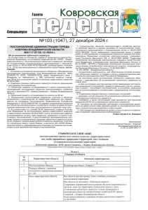 №103 (1047), 27 декабря 2024 г. ǺDzDZDzǸȌ ǸȜȐȞȜȐȟȘȎȭ Спецвыпуск Газета ПОСТАНОВЛЕНИЕ АДМИНИСТРАЦИИ ГОРОДА КОВРОВА ВЛАДИМИРСКОЙ ОБЛАСТИ №3117 ОТ 26.12.2024 г. Об установлении публичного сервитута В соответствии со статьей 23, главой V.7 Земельного кодекса Российской Федерации, на основании ходатайства АО «ОРЭС – Владимирская область» об установлении публичного сервитута, договора об осуществлении технологического присоединения к электрическим сетям от 09.04.2024 №79/784/КОВ, руководствуясь статьями 6, 31, 32 Устава муниципального образования город Ковров, постановляю: 1. Установить в интересах акционерного общества «Объединенные региональные электрические сети Владимирской области», ИНН: 3329038170, ОГРН: 1063340018785, адрес юридического лица: г. Владимир, ул. Чайковского, д. 38Б, публичный сервитут площадью 99 кв.м в отношении земель в границах кадастрового квартала 33:20:010501. 2. Утвердить границы публичного сервитута согласно приложению к настоящему постановлению. 3. Публичный сервитут устанавливается в целях строительства и последующей эксплуатации объектов электросетевого хозяйства местного значения КТП, проезд Северный, г. Ковров, Владимирская область. 4. Публичный сервитут устанавливается сроком на 49 лет. 5. Ограничения использования земельных участков и объектов капитального строительства на территории охранных зон определяются на основании Постановления Правительства Российской Федерации от 24.02.2009 №160 «О порядке установления охранных зон объектов электросетевого хозяйства и особых условий использования земельных участков, расположенных в границах таких зон». 6. В соответствии со статьей 39.46 Земельного кодекса Российской Федерации за использование земель кадастрового квартала с кадастровым номером 33:20:010501 плата за публичный сервитут устанавливается за весь срок сервитута, указанного в пункте 4 настоящего постановления, и рассчитывается пропорционально площади земель в установленных границах публичного сервитута исходя из среднего уровня кадастровой стоимости земельных участков по городскому округу город Ковров, и вносится АО «ОРЭС-Владимирская область» единовременным платежом не позднее шести месяцев со дня принятия настоящего постановления. 7. Строительство объектов электросетевого хозяйства местного значения ведется в рамках договора об осуществлении технологического присоединения к электрическим сетям от 09.04.2024 №79/784/КОВ. После завершения строительства сроки и график работ по обслуживанию и содержанию указанного имущества предусмотрены Правилами устройства электроустановок, утвержденными Приказом Минэнерго РФ от 08.07.2002 №204, Правилами технической эксплуатации электрических станций и сетей Российской Федерации, утвержденными приказом Минэнерго России от 04.10.2022 г. №1070 и Правилами технической эксплуатации электроустановок потребителей электрической энергии, утвержденными Приказом Минэнерго России от 12.08.2022 №811. 8. АО «ОРЭС – Владимирская область»: – осуществлять деятельность, для обеспечения которой установлен публичный сервитут, в порядке и сроки, предусмотренные действующим законодательством Российской Федерации, – до окончания срока установления публичного сервитута обратиться с ходатайством об установлении публичного сервитута на новый срок, – в срок не позднее чем три месяца после завершения эксплуатации инжен