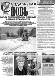 Газета основана 21 марта 1918 г. № 2 (12677) пятница, 16 января 2026 г. Общественно политическая газета 12+ БОРЬБА С ПОСЛЕДСТВИЯМИ СНЕГОПАДА В РАЙОНЕ ПРОДОЛЖАЕТСЯ На данный момент на расчистке дорог в районе задействовано около 35 единиц спецтехники. Приоритет в уборке снега отдается крупным населенным пунктам. Особое внимание уделяется территориям, где расположены социально значимые объекты: детские сады, школы и медицинские пункты. Продолжается уборка территории от снега в пос. Боголюбово. Здесь расчищены участки у школы, у детского сада в с.Новое, у здания полиции, у контейнерных площадок, а также дорожка, ведущая к с. Суромна. Коммунальные службы г. Суздаля с раннего утра ведут очистку тротуаров на улицах города. Также расчищаются подходы и подъезды к остановкам общественного транспорта. Работы ведутся в плановом порядке. Силы и техника направлены на то, чтобы постепенно, улица за улицей, привести в порядок весь город. Жителей и гостей Суздаля просят быть внимательнее на улицах, соблюдать осторожность в возможных местах гололёда, нависших сосулек и наледи на крышах домов и запастись терпением. Все службы работают для устранения последствий обильного снегопада. В Суздальском районе протяженность автомобильных дорог общего пользования местного значения составляет почти 500 километров. В основном все они относятся к пятой технической категории, имеют пятый уровень зимнего содержания. В соответствии с ГОСТ Р 50597-2017 расчистка таких дорог проводится после окончания выпадения осадков. Но кроме сложной погоды, затрудняют уборку и другие факторы: плотная застройка и узкие улицы во многих населенных пунктах района. Отсутствие специально оборудованных мест для складирования снега также создает дополнительные трудности, замедляя процесс уборки и увеличивая время, необходимое для расчистки. Администрация района старается оперативно реагировать на просьбы жителей, а также просит с пониманием отнестись к ситуации, так как в одночасье очистить всю территорию района не представляется возможным. Уважаемые жители Суздальского района! В случае несвоевременной и некачественной расчистки дорог в вашем населенном пункте, вы можете сообщить об этом по тел. 8(49231) 2-13-03 в МКУ «Управление развития инфраструктуры и дорожного хозяйства» Суздальского района. Фото М. Авсеенок. Обильные снегопады накрыли Владимирский регион, оставив слой снега толщиной больше 50 сантиметров. Борьба с последствиями непогоды продолжается. Дорожные и коммунальные службы работают в усиленном режиме по всей области, в том числе и в Суздальском районе. Справки по телефону 8 (49231) 2-08-95. ПОДПИСКА НА ГАЗЕТУ «СУЗДАЛЬСКАЯ НОВЬ» НА 1-е ПОЛУГОДИЕ 2026 ГОДА Реклама ОФОРМИТЬ ПОДПИСКУ МОЖНО В РЕДАКЦИИ по адресу: г. Суздаль, Красная пл., д.1, каб.12,18. СТОИМОСТЬ ПОДПИСКИ НА 6 МЕСЯЦЕВ: с получением в редакции - 450 руб. с доставкой на дом - 500 руб. (г. Суздаль, не менее 5 экземпляров); по району - 600 руб. УВАЖАЕМЫЕ ЖИТЕЛИ ПОСЕЛКА КРАСНОГВАРДЕЙСКИЙ, СЕЛ ПАВЛОВСКОЕ, ПОРЕЦКОЕ, ОМУТСКОЕ! Сообщаем вам, что у редакции есть возможность доставлять вам газету «Суздальская новь». Подписаться на газету можно в Красногвардейской сельской библиотеке у библиотекаря Сараевой Елены Викторовны, в Павловской библиотеке у библиотекаря Татьяны Геннадьевны Васильевой, в с. Порецкое у Галины Александровны Молчановой в магаз