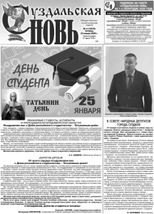 Газета основана 21 марта 1918 г. № 4 (12679) пятница, 23 января 2026 г. Общественно политическая газета 12+ Справки по телефону 8 (49231) 2-08-95. ПОДПИСКА НА ГАЗЕТУ «СУЗДАЛЬСКАЯ НОВЬ» НА 1-е ПОЛУГОДИЕ 2026 ГОДА Реклама ОФОРМИТЬ ПОДПИСКУ МОЖНО В РЕДАКЦИИ по адресу: г. Суздаль, Красная пл., д.1, каб.12,18. СТОИМОСТЬ ПОДПИСКИ НА 6 МЕСЯЦЕВ: с получением в редакции - 450 руб. с доставкой на дом - 550 руб. (г. Суздаль, не менее 5 экземпляров); по району - 600 руб. УВАЖАЕМЫЕ ЖИТЕЛИ ПОСЕЛКА КРАСНОГВАРДЕЙСКИЙ, СЕЛ ПАВЛОВСКОЕ, ПОРЕЦКОЕ, ОМУТСКОЕ! Сообщаем вам, что у редакции есть возможность доставлять вам газету «Суздальская новь». Подписаться на газету можно в Красногвардейской сельской библиотеке у библиотекаря Сараевой Елены Викторовны, в Павловской библиотеке у библиотекаря Татьяны Геннадьевны Васильевой, в с. Порецкое у Галины Александровны Молчановой в магазине, в с.Омутское у библиотекаря Веры Владимировны Савельевой. ДОРОГИЕ ДРУЗЬЯ! От всего сердца поздравляем вас с Днем российского студенчества – Татьяниным днем! Сегодня мы чествуем тех, кто носит гордое звание студента, кто неустанно стремится к новым знаниям и вершинам достижений, а также выражаем признательность тем, кто поддерживает и направляет их на этом пути. Особые, самые теплые слова сегодня хочется адресовать всем Татьянам, чье имя неразрывно связано с этим замечательным праздником. Ведь именно 25 января, день святой мученицы Татианы, с 1755 года, по указу императрицы Елизаветы Петровны, стал не просто датой в календаре, а настоящим символом российского студенчества. Именно в этот день был учрежден Московский университет, ставший колыбелью отечественной науки и образования. С тех пор святая Татиана считается покровительницей студентов и преподавателей, а этот день – праздником знаний, молодости и безграничных надежд. Студенческие годы – это не просто время учёбы. Это пора открытий, смелых идей, новых знакомств и незабываемых впечатлений. Это фундамент, на котором строится ваше будущее, закладываются основы профессионального мастерства и формируется личность. Вы, сегодняшние студенты, – наша надежда, наш потенциал, движущая сила развития. Ваши успехи в учёбе, науке, спорте, творчестве – это не просто личные достижения, это вклад в процветание нашего района, области и всей страны. Именно вам предстоит строить современное, инновационное общество, развивать экономику и укреплять позиции России на мировой арене. Мы уверены, что ваши знания, талант и целеустремленность помогут вам достичь больших успехов в учебе и будущей профессиональной деятельности. Желаем вам неиссякаемой энергии, упорства в достижении целей, веры в свои силы, успешного раскрытия своих способностей и смелости на пути к мечте! Пусть этот день станет для каждой Татьяны особым событием, наполненным радостью, теплом и вниманием близких. А святая Татиана всегда покровительствует вам, оберегает от невзгод и помогает в достижении поставленных целей. С ПРАЗДНИКОМ, ДОРОГИЕ СТУДЕНТЫ И ТАТЬЯНЫ! Алексей САРАЕВ, глава Суздальского района. Владимир КИРИЛЛОВ, председатель Совета народных депутатов Суздальского района. УВАЖАЕМЫЕ СТУДЕНТЫ, АСПИРАНТЫ И ПРЕПОДАВАТЕЛИ ВЛАДИМИРСКОЙ ОБЛАСТИ! Поздравляю вас с Днём российского студенчества – Татьяниным днём. Этот праздник – символ надежды, новых возможностей и веры в светлое будущее. Именно вы, сего
