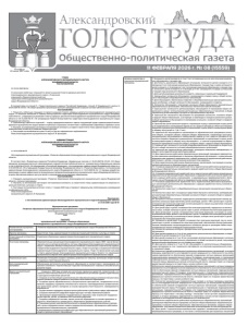 11 ФЕВРАЛЯ 2026 г. № 08 (15559) Основана 10 июня 1917 года ГЛАВА АЛЕКСАНДРОВСКОГО МУНИЦИПАЛЬНОГО ОКРУГА ВЛАДИМИРСКОЙ ОБЛАСТИ ПОСТАНОВЛЕНИЕ От 03.02.2026 № 3пг О назначении публичных слушаний по проекту решения Совета народных депутатов Александровского муниципального округа «О внесении изменений в Правила благоустройства территории Александровского муниципального округа Владимирской области» В соответствии со статьей 5.1 Градостроительного кодекса Российской Федерации, статьей 47 Федерального закона от 20.03.2025 № 33-ФЗ «Об общих принципах организации местного самоуправления в единой системе публичной власти», ПОСТАНОВЛЯЮ: 1. Назначить публичные слушания по проекту решения Совета народных депутатов Александровского муниципального округа «О внесении изменений в Правила благоустройства территории Александровского муниципального округа Владимирской области», утвержденные решением Совета народных депутатов Александровского муниципального округа Владимирской области от 03.12.2025 № 95 «Об утверждении Правил благоустройства территории Александровского муниципального округа Владимирской области». 2. Организатору публичных слушаний — отделу природопользования и охраны окружающей среды администрации Александровского муниципального округа провести публичные слушания в соответствии с требованиями нормативных правовых актов. 3. Контроль за исполнением настоящего постановления возложить на первого заместителя главы администрации по жилищно- коммунальному хозяйству и развитию инфраструктуры. 4. Настоящее постановление вступает в силу со дня его официального опубликования. Глава Александровского муниципального округа А. В. Кузнецова АДМИНИСТРАЦИЯ АЛЕКСАНДРОВСКОГО МУНИЦИПАЛЬНОГО ОКРУГА ВЛАДИМИРСКОЙ ОБЛАСТИ ПОСТАНОВЛЕНИЕ от 23.01.2026 № 55 Об утверждении муниципальной программы «Развитие образования Александровского муниципального округа Владимирской области» В соответствии с Бюджетным кодексом Российской Федерации, Федеральным законом от 20.03.2025 № 33-ФЗ «Об общих принципах организации местного самоуправления в единой системе публичной власти», руководствуясь Федеральным законом от 29.12.2012 № 273-ФЗ «Об образовании в Российской Федерации», постановлением администрации Владимирской области от 31.01.2019 № 48 «Об утверждении Государственной программы Владимирской области «Развитие образования», постановлением администрации Александровского муниципального округа Владимирской области от 16.01.2026 № 32 «О порядке разработки, реализации и оценки эффективности муниципальных программ Александровского муниципального округа Владимирской области», в целях обеспечения равного доступа детей к полноценному качественному образованию, ПОСТАНОВЛЯЮ: 1. Утвердить муниципальную программу «Развитие образования Александровского муниципального округа Владимирской области» согласно приложению. 2. Контроль за исполнением настоящего постановления возложить на заместителя главы администрации по вопросам социальной политики, культуры и спорта. 3. Настоящее постановление вступает в силу с 1 января 2026 года и подлежит официальному опубликованию и размещению на официальном сайте. Глава Александровского муниципального округа А. В. Кузнецова Приложение к постановлению администрации Александровского муниципального округа Владимирской области от 23