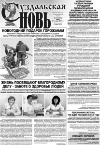 Газета основана 21 марта 1918 г. № 3 (11544) среда, 21 января 2015 г. Общественно политическая газета НОВОГОДНИЙ ПОДАРОК ГОРОЖАНАМ В Суздале появилось современное, экономичное, эффективное уличное освещение. В самых густонаселенных жилых кварталах города на улицах Гоголя и Садовой, бульваре Всполье буквально на днях произойдет замена 165 морально устаревших ртутных светильников (мощностью 250 Вт) на энергосберегающие светодиодные мощностью 145 Вт, которые светят значительно ярче прежних. Стоимость всех работ 2 млн. 673 тыс. рублей. Примечательно, что финансовое участие в этом проекте городской администрации ограничивается 248 тыс. рублей. Немаловажно, что и подрядные работы выполняют специалисты из ОП ОАО «ВОЭК» «Суздальская горэлектросеть». А это значит, что из общей суммы, потраченной на осуществление проекта, 280 тыс. рублей останутся в Суздале и пойдут на оплату труда нашим электрикам. Большая же часть затрат – это средства из федерального и областного бюджетов. Не лишним будет заметить, что решение о модернизации уличного освещения в Суздале было принято Губернатором Владимирской области С.Ю. Орловой. И еще один приятный момент сообщил глава администрации города А.В. Разов. Демонтированные светильники будут проверены и испытаны, добротные установят в слабо освещенных микрорайонах Суздаля, таких как Толстовский. Использование светодиодных светильников принесет администрации за год около 400 тыс. рублей экономии. Эти средства городские власти планируют направить на дальнейшую модернизацию уличного освещения. Владимир СУХОВ. Фото автора. РЕШЕНИЕ О МОДЕРНИЗАЦИИ УЛИЧНОГО ОСВЕЩЕНИЯ В СУЗДАЛЕ БЫЛО ПРИНЯТО ГУБЕРНАТОРОМ ВЛАДИМИРСКОЙ ОБЛАСТИ С.Ю. ОРЛОВОЙ МЕДРАБОТНИКИ ГОСУДАРСТВЕННЫХ УЧРЕЖДЕНИЙ ЗДРАВООХРАНЕНИЯ ВЛАДИМИРСКОЙ ОБЛАСТИ ПОЛУЧАТ МЕРЫ СОЦИАЛЬНОЙ ПОДДЕРЖКИ ПРИ ИПОТЕЧНОМ ЖИЛИЩНОМ КРЕДИТОВАНИИ Губернатор Светлана Орлова утвердила Порядок предоставления мер социальной поддержки медицинским работникам организаций государственной системы здравоохранения Владимирской области при ипотечном жилищном кредитовании. Эти меры социальной поддержки предоставляются: - медицинским работникам, имеющим высшее или среднее профессиональное (медицинское) образование, в возрасте не старше 40 лет; - медицинским работникам, в семье которых двое и более членов семьи работают на должностях медицинских работников в медицинских организациях государственной системы здравоохранения Владимирской области; - врачам-специалистам и заведующим структурными подразделениями медицинских организаций - врачам-специалистам, участвующим в оказании высокотехнологичной медицинской помощи. Медицинский работник может реализовать свое право на получение мер социальной поддержки в соответствии с настоящим Порядком только один раз. Меры социальной поддержки предоставляются в форме денежных выплат: - субсидии на уплату первоначального взноса по ипотечному жилищному кредиту (займу) в размере 20 процентов от расчетной стоимости приобретаемого жилого помещения (исходя из средней рыночной стоимости 1 квадратного метра жилья в соответствующем муниципальном образовании, определяемой органами местного самоуправления, но не более стоимости 1 квадратного метра жилья, определяемой уполномоченным Правительством России федеральным органом исполнительной вла
