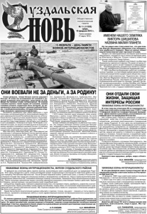 Газета основана 21 марта 1918 г. № 11 (11552) среда, 18 февраля 2015 г. Общественно политическая газета Снова февраль. Снова белым снегом укрывает Россию. И снова мы вспоминаем её сыновей и дочерей, отдавших свое здоровье, свою жизнь за неё. Вроде бы громкие слова, литературные. Но какими словами оценить тихий подвиг её сыновей, какими словами утешить сердечную боль матерей, не дождавшихся своих питомцев с далеких рубежей Родины, с необъявленной войны, которую политики стыдливо называли «локальным конфликтом». Незаметно пробежали года, давно вернулись с поля боя воины-интернационалисты, выполнившие приказ Родины в Демократической Республике Афганистан, в Республике Ангола, в других уголках нашей планеты. Они воевали не за деньги. Они воевали за правду, за то, чтобы народы многих стран сами решали, как им жить, кого уважать и кого ненавидеть. И всегда в истории 19-20 веков, в новейшей истории, на защиту интересов многих больших и малых народов становилась великая Россия. А политику нашей страны проводили в жизнь молодые ребята, воины русской, советской, российской армии. Идя навстречу памятным дням, мы с благодарностью вспоминаем и ветеранов Великой Отечественной войны полковников Никифорова А.В., Юрина М.М., капитанов Антонова М.Н., Алехина Л.С., ст.лейтенанта Гуреева Н.К., лейтенанта Дмитриева В.С., прапорщика Барскова А.М., старшину Ильину К.В., старших сержантов Громова В.Н., Дронова И.А., Плаксину Е.А., сержантов Виноградова В.М., Денисова Ф.П., Костина В.Е., Климова И.Н., Москвичева А.В., Силуянова И.А., Сорухан Н.А., рядовых Белову В.Н., Гребенюка В.Л., Гришину Н.Е., Максимова П.А., Ноздрина Н.В., Китаева А.И., Квелидзе Ю.Ш., Коваленко Т.С., Лоткова И.С., Лоншакова Н.Г., Панина В.Д., Петрасову З.А., Рябцеву К.Ф., Салгирееву М.И., Серопахову П.Е., Сосину Т.А., Сарапулова З.С., Шибаеву М.Г., Шлыкова Н.Н., Чижову А.М., Чичерину З.Н.,Шипулина С.В., Шишкина П.П., Яшина М.И. и воинов-интернационалистов полковников Гайнуллина Ф.М., Казанского В.М., Синькова В.В., Тенькова И.М., подполковников Ерусенко А.В., Зотова В.В., Каплина С.А., Перфилова В.В., Чинкина Р.М., майоров Босянок А.Е., Булавина Н.С.,Великова А.А., Горбунова М.А., Иванова В.В., Киселева В.А., Короткова В.А., Котлякова А.А., Кривова А.Н., Куницына А.М., Лебедева Ю.Н., Нестерова А.А., Олейникова О.Э., Радаева С.В., Рачко А.В., Родионова А.И., Рюмцева Ю.А., Рябова В.Е., Ульянова С.Н., Чурикова Н.К., Шило С.А., Щур Н.А., сержантов Ильина А.В., Губанова В.И., Суслова С.В., Гришина А.В., рядовых Веретенникова Ю.Н., Костенко В.Г., Гридина О.В., Семенова Ю.С., Клопцова В.В., Климова Н.Б., Шальнова С.Б. и многих других воинов, послуживших верой и правдой своему Отечеству. 11073 наших земляка ушли защищать свою землю. Вернулись с войны только 3928 фронтовиков. На полях сражений от Бреста до Москвы и Сталинграда, от Курска до Будапешта и Вены, Праги и Берлина сложили головы 7145 героев, уроженцев Суздальской земли. Четыре человека не вернулись из Афганистана живыми. Это гвардии лейтенант Белкин Станислав Николаевич, младший сержант Шипицын Анатолий Геннадьевич, младший сержант Сасаев Вадим Евгеньевич, рядовой Успенский Михаил Юрьевич. В четырех личных делах военнослужащих написано лаконичное: «Выполняя боевое задание, верный военной присяге, проявив стойкость и мужество, погиб...». Вспоминая героев, мы оцениваем нынешнюю молодежь, мы спрашиваем себя и их: сможете как старшие братья, как отцы,