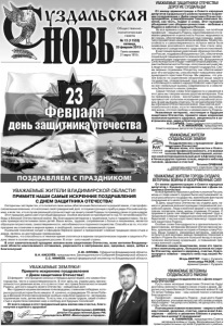 Газета основана 21 марта 1918 г. № 12 (11553) пятница, 20 февраля 2015 г. Общественно политическая газета УВАЖАЕМЫЕ ЖИТЕЛИ ВЛАДИМИРСКОЙ ОБЛАСТИ! ПРИМИТЕ НАШИ САМЫЕ ИСКРЕННИЕ ПОЗДРАВЛЕНИЯ С ДНЕМ ЗАЩИТНИКА ОТЕЧЕСТВА! Сегодня мы чествуем тех, кто посвятил свою жизнь обеспечению безопасности родной земли, став профессиональным военным, кто исполнил свой гражданский долг, отслужив срочную службу в рядах Российской Армии, и всех тех, кто в случае реальной угрозы встанет на защиту своей Родины по примеру своих отцов и дедов. Этот праздник давно уже стал общенародным. Особое звучание он приобретает в год 70-летия Великой Победы в Великой Отечественной войне. Мы благодарим ветеранов и тружеников тыла и гордимся вами. На вашем примере воспитываем своих детей. Ваша жизнь, трудная, сопряженная с болью и лишениями, является образцом патриотизма, самоотверженности, несгибаемости и подлинного мужества. Спасибо и за то, что этот праздник мы отмечаем в мирное время, в свободной, сильной и независимой стране. Нынешнее поколение солдат и офицеров бережно хранит и преумножает славные традиции своих отцов и дедов, являясь их достойными преемниками. Убеждены, что способность в тяжелое время сплотиться в едином патриотическом порыве и защитить Родину лежит в основе мироощущения россиян. В этом - сила нашей страны. В этот замечательный праздник желаем всем защитникам Отечества, всем жителям Владимирской области неиссякаемого оптимизма, уверенности в завтрашнем дне, здоровья, мира, добра и благополучия! С.Ю. ОРЛОВА, Губернатор Владимирской области. В.Н. КИСЕЛЁВ, председатель Законодательного Собрания Владимирской области. С.С. МАМЕЕВ, главный федеральный инспектор по Владимирской области. УВАЖАЕМЫЕ ЗАЩИТНИКИ ОТЕЧЕСТВА! ДОРОГИЕ СУЗДАЛЬЦЫ! От имени администрации и Совета народных депутатов Суздальского района примите искренние поздравления с Днём защитника Отечества - праздником, утверждающим такие извечные понятия, как честь, подвиг и слава. Этот праздник объединяет нас общими ценностями - любовью к Родине и заботой о будущем России. Во все времена солдаты и офицеры, чья почётная профессия – защищать Родину, самоотверженно отстаивали суверенитет и целостность России, нерушимость ее границ, обеспечивая мирный труд граждан, развитие и процветание нашей великой державы. Мужество, стойкость и самоотверженность испокон веков были символами российского воинства. Они стали залогом мирного созидательного труда многих поколений. В настоящее время укрепление обороноспособности России, поддержка Вооруженных Сил, обеспечение социальной защищенности военнослужащих являются важнейшими задачами государства. Вооруженные Силы всегда были и будут главной опорой державы, гарантом безопасности России, оплотом ее могущества, а люди в погонах - надежной опорой государства. Своим верным служением Отечеству они обеспечивают рост его могущества, способствуют повышению международного престижа России. Мы уверены, что усилия власти по укреплению оборонной мощи нашего государства, созидательный труд россиян, единство и сплоченность нашего народа позволят нам ответить на все глобальные вызовы современности и обеспечить безопасность наших граждан. Самые теплые слова благодарности и уважения в этот день мы говорим нашим дорогим ветеранам. Они по-прежнему в строю – в