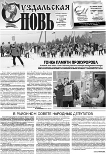 Газета основана 21 марта 1918 г. № 15 (11556) среда, 4 марта 2015 г. Общественно политическая газета Около двухсот лыжников приняли участие в гонке, посвящённой Алексею Прокуророву. Этот старт совместными усилиями организовали СПК «Спасское», администрация Суздальского района и администрация Павловского сельского поселения. Участвовать в гонке памяти олимпийского чемпиона, трагически ушедшего из жизни, могли все желающие. На открытии соревнований спортсменов приветствовали директор СПК «Спасское», член политсовета местного отделения Партии «ЕДИНАЯ РОССИЯ» А.И.Шарагин, заместитель главы Павловского сельского поселения Т.А.Письменная, двукратная олимпийская чемпионка Ольга Данилова. Аномально теплая погода внесла свои коррективы в состояние трассы, но благодаря неимоверным усилиям инструктора по спорту СПК «Спасское», главного судьи соревнований Ю.Ю. Юрьева старты состоялись и все спортсмены остались довольны. Активными участниками соревнований стали лыжники Суздальского района. Победителями в личном зачете стали Яков Мокеев из с. Весь, Милена Мартынова и Полина Губанова из села Спасское-Городище, Семен Комаров из г. Суздаля. В командных соревнованиях среди трудовых коллективов победу одержала команда ЗАО «Суворовское», возглавлял которую директор С.Ю. Трутнев . Среди школьных команд победителями стали лыжники Спасско-Городищенской школы. Самыми возрастными участниками соревнований были признаны: среди мужчин А.И. Митрофанов 1938 г.р., среди женщин Г.Т. Калашникова 1964 г.р. Самыми юными лыжниками среди девочек были Алена Шарагина 2011 г.р., среди мальчиков Денис Сашенков 2008 г.р. Все победители и призеры были награждены медалями, грамотами и ценными призами. Грамоты и медали, конечно, — приятное поощрение. Но победа была не столь важна. Каждый из стартовавших осознавал, что это не просто соревнования, а в первую очередь дань памяти Алексею Прокуророву. Н. КУРАШКИН. Фото автора. ГОНКА ПАМЯТИ ПРОКУРОРОВА В первый день весны в селе Спасское-Городище прошли традиционные соревнования по лыжным гонкам памяти олимпийского чемпиона Алексея Прокуророва. Лучший способ сохранить память об ушедшем из жизни человеке – продолжать его дело. Состоялось очередное заседание Совета народных депутатов Суздальского района. В повестке дня было 9 вопросов, которые депутаты предварительно детально рассмотрели на комиссиях. В работе Совета принял участие А.М. Шариков, старший помощник Суздальского межрайонного прокурора. В начале заседания с информацией по итогам работы отдела Министерства внутренних дел России по Суздальскому району за 2014 год выступил его начальник Д.А. Ильин. Как отметил докладчик, по всем позициям отдел имеет положительные показатели. По итогам прошлого года ОМВД по Суздальскому району входит в пятерку лучших отделов по Владимирской области. Д.А. Ильин констатировал, что общее количество зарегистрированных преступлений на территории Суздальского района за 12 месяцев 2014 года составило 559 преступлений. В структуре преступности тяжкие и особо тяжкие преступления составляют 28,6%. Умышленных убийств зарегистрировано 4, причинение тяжкого вреда здоровью – 6, изнасилование – 1, раскрываемость всех этих видов преступлений 100%, кроме убийств, раскрываемость которых составляет 66,7%. В 2014 году зарегистрировано 288 краж, следствие по которы