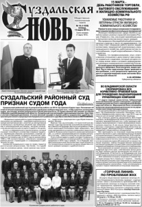 Газета основана 21 марта 1918 г. № 18 (11559) пятница, 13 марта 2015 г. Общественно политическая газета «ГОРЯЧАЯ ЛИНИЯ» ПО ПРОБЛЕМАМ ЖКХ 20 марта общественная приемная сенатора Антона Владимировича Белякова проводит «горячую линию» связи с населением по проблемам ЖКХ. По приглашению сенатора на вопросы жителей ответит председатель правления Регионального центра общественного контроля в жилищно-коммунальной сфере «ЖКХ-Контроль» Альберт Анатольевич Русанен. Выйти на прямой контакт с руководителем Регионального центра «ЖКХ-Контроль» жители смогут 20 марта с 14.00 до 16.00. Вопросы граждан также принимаются помощниками сенатора Антона Белякова заранее - с 16 по 19 марта с 9.00 до 16.00 по телефону/ факсу 8 (4922) 53-18-15. – Формально оценка работы судов складывается из нескольких составляющих – оценивается длительность сроков рассмотрения дел, качество их рассмотрения (стабильность вынесенных решений при обжаловании в апелляционной инстанции), нагрузка (количество рассмотренных дел на одного судью) и так далее. Но есть и неформальная сторона вопроса, которая отражает способность коллектива слаженно трудиться, надлежащим образом организовать сложную работу по рассмотрению огромного количества гражданских и уголовных дел (в 2014 году их рассмотрено 1298 и 138 соответственно), обеспечить гражданам равный доступ к правосудию и к информации о деятельности суда. Коллектив Суздальского суда по праву гордится достигнутыми результатами, тем более, что судьёй года по уголовным делам, также признан наш коллега – заместитель председателя суда Юрий Александрович Мокеев. Вместе с тем, мы осознаём, что такое почётное звание как «Суд года» возлагает на коллектив огромную ответственность в будущем. Достигнутый уровень отправления правосудия необходимо будет удерживать, при этом одновременно устраняя и имеющиеся недостатки в работе. В наших силах сократить сроки рассмотрения дел, а с учётом сформировавшегося профессионального состава – повысить качество их рассмотрения. Я хочу поблагодарить судей и аппарат Суздальского районного суда за ту огромную работу, которую они проделали в 2014 году и уверен, что в будущем профессиональные качества коллектива только возрастут, что положительно отразится на жизни общества и повысит доверие граждан к судебной власти. СУЗДАЛЬСКИЙ РАЙОННЫЙ СУД ПРИЗНАН СУДОМ ГОДА Суздальский районный суд по результатам работы за 2014 год признан Судом года. Положение об этой почётной номинации разработано судейским сообществом для того, чтобы отметить коллективы судов, достигшие лучших результатов в своей деятельности. В торжественной обстановке на общем собрании судей Владимирской области, Суздальский суд награждён переходящим призом «Суд года» и соответствующим дипломом. О столь высокой награде и оценке работы суздальских судей мы попросили рассказать председателя Суздальского районного суда Ярослава Николаевича МОРКОВКИНА. Поздравляем! Юрий Александрович Мокеев признан судьей года по уголовным делам. Ярослав Николаевич Морковкин с призом «Суд года». Коллектив Суздальского районного суда. УВАЖАЕМЫЕ РАБОТНИКИ И ВЕТЕРАНЫ ОТРАСЛИ ЖИЛИЩНОКОММУНАЛЬНОГО ХОЗЯЙСТВА! Примите мои самые искренние поздравления с вашим профессиональным праздником! Жилищно-коммунальная сфера является одной из самых сложных отраслей экономики России. И