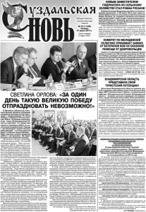 общественно политическая газета УЗДАЛЬСКАЯ 2 № 22 (11563) пятница, 27 марта 2015 г. ДЕЛА. СОБЫТИЯ. ЛЮДИ С 1 АПРЕЛЯ СОЦИАЛЬНЫЕ ПЕНСИИ И ПЕНСИИ ПО ГОСУДАРСТВЕННОМУ ПЕНСИОННОМУ ОБЕСПЕЧЕНИЮ ВЫРАСТУТ НА 10,3%, ЕДВ – НА 5,5% 25 марта состоялось очередное заседание Совета народных депутатов Суздальского района. В повестке дня было 8 вопросов, главным из которых был отчет о результатах деятельности Главы Суздальского района и районной администрации за прошлый год. В работе Совета принимал участие старший помощник суздальского межрайонного прокурора А.М. Шариков. О результатах деятельности Главы муниципального образования Суздальский район и администрации района за 2014 год народным избранникам доложил Глава района А.П. Сараев. Он отметил, что деятельность его и районной администрации была направлена на организацию работы по реализации экономических и социальных программ, обеспечению роста доходов населения, соблюдению прав и гарантий граждан. Социально-экономическое положение Суздальского района можно оценить как стабильное и в целом соответствующее текущей ситуации в экономике Владимирской области. Основными положительными результатами за прошедший год являются сохранение ряда социально-экономических показателей, реализация важнейших программ, направленных на улучшение качества жизни населения Суздальского района. Несмотря на сложности и негативные процессы, происходящие в экономике, в 2014 году удалось сохранить достаточно высокие темпы развития в промышленности, строительстве, развития отраслей растениеводства. Главными целями социальной политики администрации района остаются повышение уровня и качества жизни населения, снижение уровня социального неравенства, обеспечение равного доступа граждан к системе социальных базовых услуг. Значительное внимание уделялось организации предоставления общедоступного и бесплатного школьного и дошкольного образования. Увеличено финансирование отрасли «Образование», включая реализацию мероприятий по модернизации материально-технической базы системы образования. Продолжается работа по организации электро-, газоснабжения поселений. Под особым контролем находятся вопросы подготовки объектов коммунальной инфраструктуры и социальной сферы к отопительному периоду. Как отметил докладчик, продолжена работа по повышению качества и доступности предоставления муниципальных услуг, в том числе по организации межведомственного и электронного взаимодействия. В обсуждении доклада приняли участие депутаты С.В. Симонова и А.П. Храмов, А.Н. Михайлов. В результате, заслушав отчет А.П. Сараева, Совет народных депутатов Суздальского района принял решение признать работу Главы муниципального образования Суздальский район и возглавляемой им администрации района по итогам работы за 2014 год удовлетворительной. Депутаты внесли изменения и дополнения в бюджет Суздальского района на 2015 год. Утверждены основные характеристики районного бюджета на текущий год. Прогнозируемый общий объем доходов в сумме 683242,1 тыс. руб., общий объем расходов – 690344, 1 тыс. руб., дефицит районного бюджета – 7102 тыс. руб., верхний предел муниципального долга Суздальского района на 1 января 2016 года в сумме 93000 тыс. руб., в том числе верхний предел долга по муниципальным гарантиям в сумме 0,0 тыс. руб., предельный объем муниципа