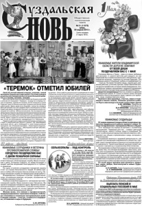 Газета основана 21 марта 1918 г. № 31 (11572) среда, 29 апреля 2015 г. Общественно политическая газета УВАЖАЕМЫЕ СУЗДАЛЬЦЫ! От имени администрации и Совета народных депутатов Суздальского района примите самые тёплые поздравления с праздником Весны и Труда! Этот праздник мы всегда встречаем с особенным настроением. Первомай для нас – символ цветущей теплой весны, яркого солнца, мира и созидания. Он несет в себе мощный заряд позитивной энергии и объединяет нас общим стремлением к миру, согласию и благополучию. Понимание важности трудовой деятельности, как главной составляющей современного общества, придаёт смысл нашей жизни и приносит истинную радость от сделанного. Такой позитивный настрой служит импульсом к прогрессу и социальному благополучию. Мы выражаем особую благодарность ветеранам труда, всем тем, кто сегодня вкладывает свои силы, знания, опыт в социально-экономическое развитие района и закладывает хорошие перспективы роста на будущее. На пути к поставленным целям мы возлагаем большие надежды на нашу молодёжь, которая, освоив новые профессии и сохранив лучшие традиции, сможет успешно реализовать себя в профессиональной деятельности. От всей души желаем вам крепкого здоровья, мира, добра, благополучия и новых трудовых побед! А.П.САРАЕВ, Глава Суздальского района. А. Н. МИХАЙЛОВ, председатель Совета народных депутатов Суздальского района. УВАЖАЕМЫЕ СОТРУДНИКИ И ВЕТЕРАНЫ ПРОТИВОПОЖАРНОЙ СЛУЖБЫ! СЕРДЕЧНО ПОЗДРАВЛЯЮ ВАС С ДНЁМ ПОЖАРНОЙ ОХРАНЫ! Жители Владимирской области высоко ценят вашу ответственную и благородную службу. Ваше отношение к делу, которому служите, по праву вызывает у людей чувства искренней благодарности и глубокого уважения. Не одно столетие сотрудники пожарной охраны стоят на страже безопасности людей. В любое время и в любых обстоятельствах вы всегда на посту. Никогда пожарная служба не прекращала своей работы. Владимирских пожарных отличает профессионализм, мгновенная реакция, интуиция, основанная на глубоких знаниях и опыте. Особые слова благодарности - ветеранам противопожарной службы. Ваши знания и опыт бесценны. Вы храните традиции пожарного дела. Являетесь примером для молодого поколения. Спасибо за ваш многолетний труд, за всё то, что вы сделали для безопасности жителей Владимирской земли! Желаю всем, кто связан с профилактикой, предупреждением и тушением пожаров, побольше спокойных и поменьше экстремальных дней. А вашим семьям – счастья, стойкости и выдержки, оптимизма и веры в будущее. С.Ю.ОРЛОВА, Губернатор Владимирской области. ВЫПЛАТА ПЕНСИЙ И СОЦИАЛЬНЫХ ПОСОБИЙ В МАЕ Отделение ПФР по Владимирской области сообщает, что в связи с предстоящими майскими праздниками выплата пенсий и иных социальных выплат будет производиться в следующем порядке. Со 2 мая предприятия федеральной почтовой связи начнут осуществлять доставку пенсий и других выплат за 3 и 4 мая 2015 г. , 8 мая будет производиться выплата за 9 число. Жители области будут получать майские пенсии в соответствии с ежемесячным графиком. Обращаем внимание: возможны изменения графика выплаты пенсий в отдельных территориях Владимирской области. Отделение Пенсионного фонда РФ по Владимирской области информирует... «ТЕРЕМОК» ОТМЕТИЛ ЮБИЛЕЙ Свой 25-летний юбилей отметил, пожалуй, самый молодой в Суздале детский сад № 4. По этому поводу в дошк