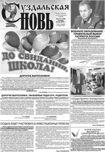 Газета основана 21 марта 1918 г. № 37 (11578) пятница, 22 мая 2015 г. Общественно политическая газета ВОЕННОЕ ОБРАЗОВАНИЕ - ПРАВИЛЬНЫЙ ВЫБОР ПАТРИОТА РОССИИ! Уважаемый абитуриент! Выбирая вуз Министерства обороны Российской Федерации для получения высшего образования, вы выбираете широкие возможности для самореализации, достойный уровень жизни, высокий социальный статус. Вы выбираете профессию офицера, а офицерский корпус – главный стержень Вооруженных Сил России. Нравственные качества, умственные и физические способности, которые вы приобретете во время учебы, позволят вам стать ценным специалистом в своем деле и занять достойное место в обществе. В этом вам помогут лучшие педагоги, командиры, специалисты, которые собраны в вузах Минобороны России. Особое место в образовательных программах российских военных вузов занимает развитие характера и привитие лидерских качеств будущим офицерам. Осваивая «науку побеждать», вы получите не только профессиональные навыки, но и значительно расширите свой кругозор, научитесь работать с людьми, находить правильные ответы на непростые вопросы, которые задает нам сама жизнь. С. К.ШОЙГУ, министр обороны Российской Федерации, генерал армии. ДОРОГИЕ ВЫПУСКНИКИ! Вот и завершился ваш последний школьный учебный год. Прощальный звон колокольчика возвещает в эти дни о том, что беззаботное детство кончилось, и впереди новый, ответственный этап жизни. Так что праздник последнего звонка – он всегда торжественный, счастливый и немного грустный одновременно. Окончание учебы – повод для торжества и гордости за тех, кто 11 лет усердно занимался, расширял свой кругозор, радовал педагогов хорошими знаниями, а родителей – оценками. От души поздравляю всех, кто научился учиться – это одно из самых полезных человеческих качеств, которое всегда будет выручать в жизни. Простившись с родной школой или лицеем, вы вступаете на путь самостоятельного принятия решений и главного выбора в своей судьбе – не только кем стать, но и каким стать. Пусть этот выбор будет удачным. Владимирской земле очень нужны продвинутые, умелые и умные , активные молодые люди! Желаю вам успешной сдачи ЕГЭ, получения заслуженных «аттестатов зрелости» и дальнейших уверенных шагов в удачном выборе и освоении профессии. В ДОБРЫЙ ПУТЬ! С.Ю.ОРЛОВА, Губернатор Владимирской области. ДОРОГИЕ ВЫПУСКНИКИ, УВАЖАЕМЫЕ ПЕДАГОГИ, РОДИТЕЛИ! ПЛОДОТВОРНО ПОРАБОТАЛИ СУЗДАЛЬ БУДЕТ УЧАСТВОВАТЬ В ИНВЕСТИЦИОННЫХ ПРОЕКТАХ А.П. САРАЕВ, Глава Суздальского района. А.Н. МИХАЙЛОВ, председатель Совета народных депутатов Суздальского района. Это одновременно и праздник, и время прощания со школой, которая на протяжении многих лет была вторым домом, дала необходимые знания, научила преодолевать трудности, подарила настоящих друзей. Последний звонок не только завершает школьную пору, но и открывает двери во взрослую жизнь, полную новых знаний, удивительных открытий и серьезных свершений. Впереди вас ожидают последние школьные испытания, которые откроют дорогу в большой интересный мир, мир полный новых перспектив, самостоятельных исканий и самореализации. Уверены, что знания, полученные в школе, будут для вас хорошей опорой, что вы серьезно подойдете к выбору будущей профессии и станете высококлассными специалистами. Особую признательность выражаем педагогам и род