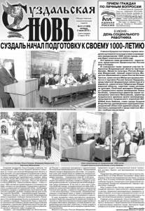 Газета основана 21 марта 1918 г. № 41 (11582) пятница, 5 июня 2015 г. Общественно политическая газета Открывая заседание, Ольга Голодец отметила, что празднование 1000-летия Суздаля является знаковым не только для жителей Владимирской области и всех россиян, но и для мирового сообщества в целом. Суздаль привлекает туристов со всего мира как один из самых самобытных древнерусских городов. Здесь находится более 300 уникальных памятников русской истории, архитектуры и культуры. Ряд из них включен в список ЮНЕСКО. «Наша основная задача – чтобы город с 1000-летней историей перешел к потомкам в том виде, которого он заслуживает. Сохранив его самобытность и уникальный исторический облик, необходимо развивать Суздаль в современном пространстве. Делать его наряднее, удобнее, комфортнее как для гостей, так и для его жителей», - подчеркнула вице-премьер. Светлана Орлова от лица жителей Владимирской области выразила глубокую признательность Президенту России Владимиру Путину за внимание, которое он проявил к Суздалю. Подписание Указа о подготовке тысячелетнего юбилея города практически совпало по времени с принятием Правительством России программы антикризисных мер, что многократно увеличило ценность решения главы государства. «Суздаль – настоящий бриллиант на «Золотом кольце России» с огромным культурным и туристическим потенциалом международного уровня. Празднование юбилея города в федеральном масштабе - это уникальный шанс для нашей области совершить мощный рывок в реализации богатейшего потенциала, в развитии сферы туризма», - подчеркнула глава 33-го региона. Сегодня перед оргкомитетом стоит задача найти решения застарелых проблем и вывести Суздаль на новый уровень развития, сохранив для жителей комфортную среду проживания. В частности, речь идет о благоустройстве города, о модернизации системы ЖКХ, о развитии транспортной инфраструктуры и увеличении гостиничного фонда, о ремонте социальных объектов – в том числе больницы, поликлиники, общеобразовательных и спортивных школ, а также о насыщении событийного календаря, способного привлекать туриста. В ходе заседания члены оргкомитета предложили ряд интересных инициатив по развитию Суздаля. В частности, Светлана Орлова высказала идею провести в Суздале Фестиваль медовухи, которая является традиционным для этих мест напитком, а также создать в Суздале Всероссийский центр народных художественных промыслов. Министр культуры России Владимир Мединский предложил создать муниципальный аналог поисковой системы «Букинг» для бронирования гостиниц в Суздале. Председатель наблюдательного совета группы компаний Bosco di Cillegi Михаил Куснирович представил образцы творчества владимирских мастериц, которые могут лечь в основу коллекции одежды, создаваемой к юбилею Суздаля. Концепция стиля предполагает использование элементов владимирских народно-промысловых традиций. Мэр Суздаля Игорь Кехтер поделился планами по созданию крупного туристического информационного центра, предложил законодательно приравнять гужевые повозки, на которых оказываются услуги по перевозке пассажиров, к общественному транспорту, что даст дополнительный доход в городской бюджет. Подводя итоги заседания, Ольга Голодец поставила задачи за ближайшие два месяца проработать вопросы, связанные с территориальным п