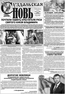 Газета основана 21 марта 1918 г. № 42 (11583) среда, 10 июня 2015 г. Общественно политическая газета ПОЗДРАВЛЯЮ ВАС С ДНЕМ РОССИИ – ВАЖНЕЙШИМ ГОСУДАРСТВЕННЫМ ПРАЗДНИКОМ НАШЕЙ РОДНОЙ СТРАНЫ! В этот день мы чувствуем особую гордость за многовековую историю Отчизны, за наш бесценный духовный и культурный потенциал, за подвиги наших соотечественников, создавших могучую державу и не раз отстоявших независимость страны. День России – символ национального единения и гордости за Отечество. Наша общая задача - передавать из поколения в поколение традиции любви к родной земле, ответственно трудиться на благо своей малой Родины и всей страны, быть активными гражданами, поддерживать новаторские решения и творческие идеи для движения вперед. Ведь уверенное развитие и процветание России зависит от каждого из нас! Желаю вам, дорогие земляки, новых достижений на благо Отечества, добра и благополучия! С ПРАЗДНИКОМ! Григорий АНИКЕЕВ, депутат Государственной Думы РФ, председатель ВПОО «Милосердие и порядок». ДОРОГИЕ ЗЕМЛЯКИ! НА ПРАЗДНИК - ВСЕЙ СЕМЬЕЙ! УВАЖАЕМЫЕ ЖИТЕЛИ И ГОСТИ ГОРОДА СУЗДАЛЯ! Администрация города Суздаля приглашает вас всей семьей на праздник, посвященный Дню России. Он состоится 12 июня 2015 года в 11 часов в парке им. 950-летия Суздаля. В праздновании примет участие вице-губернатор Владимирской области Дмитрий Анатольевич Хвостов. В рамках праздника – концерт, открытие детской площадки, показательные выступления спортсменов, конкурсы, торговля выпечкой, мороженым, прохладительными напитками. ПРИХОДИТЕ, БУДЕТ ВЕСЕЛО И ИНТЕРЕСНО! У Золотых ворот состоялась торжественная встреча митрополита Крутицкого и Коломенского Ювеналия. Церковного иерарха встречали хлебом-солью. Губернатор Светлана Орлова тепло приветствовала высокого гостя на святой Владимирской земле. В Успенском соборе митрополит Крутицкий и Коломенский Ювеналий совершил молебен. Перед его началом у входа в главный храм Владимирской митрополии он обратился с приветственным словом к жителям и гостям города. «Для нас 1000-летие со дня кончины святого равноапостольного князя Владимира – это повод к размышлению о том, что принесла вера Христова нашему народу. Прошло более тысячи лет, и мы можем свидетельствовать о следах этой веры в истории, архитектуре, литературе, но, самое главное, в сердцах наших людей, которые в течение многих веков вдохновлялись и защищались этой верой», - сказал иерарх. Митрополит Ювеналий также отметил, что с большой радостью получил благословение ехать во Владимирскую область. «Мне дорога история, святыни и люди, которые сохранили эти святыни на славной, благословенной Владимирской земле», - подчеркнул он. Говоря о важности деятельности князя Владимира для становления российской государственности, Светлана Орлова сказала: «Заслуги князя Владимира перед российским государством огромны. Не случайно в народе его называли «Красное солнышко». Сегодня очень важно, чтобы каждый из нас знал и помнил свою историю. Эта память станет надежным фундаментом для новых свершений во имя развития и процветания Великой России», - подчеркнула глава 33-го региона. «Владимирская область – оплот живой православной веры. Молитвами живет и дышит наша земля. Сегодня очень важно знать историю государства Российского, которая основывалась на вере, благочестии и добрых дела