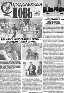 Общественнополитическая газета № 43(11584) среда, 17 июня 2015 г. Газета основана 21 марта 1918 г. ДЕНЬ РОССИИ посвятили ДЕТЯМ - БУДУЩЕМУ НАШЕЙ СТРАНЫ 12 июня в городском парке им. 950-летия Суздаля состоялся веселый, неформальный праздник, посвященный Дню России. Его подготовили и провели администрация города и работники Центра культуры и досуга. Поздравить жителей древнего Суздаля пришли руководители города Игорь Кехтер и Александр Разов, заместитель Главы администрации Суздальского района Татьяна Срибная. В празднике принял участие вице-губернатор Дмитрий Хвостов. Разнообразная программа учитывала интересы всех поколений суздальцев, но ее большая часть была посвящена будущему страны - детям. И это не случайно. В главный национальный праздник России в преображенном парке начала работать детская площадка с качелями, каруселями, горками, полосой препятствий, тренажерами, велодорожками. Восторгу мальчишек и девчонок не было предела! Довольными остались родители, бабушки и дедушки. Самые лучшие отзывы за такой замечательный подарок младшему поколению суздалян и слова благодарности руководству города звучали от всех пришедших на праздник. И это только начало большой работы по подготовке Суздаля к его 1000-летнему юбилею. На главной сцене парка прошел концерт детских коллективов и солистов, состоялись выступления юных спортсменов, кукольный спектакль. В начале праздника Дмитрий Хвостов и начальникУФМС России по Владимирской области в Суздальском районе Алексей Савельев вручили паспорта юным гражданам Российской Федерации Дарье Продиус и Илье Пронину. Волонтеры Партии «ЕДИНАЯ РОССИЯ» раздавали детям мороженое, бойко шла торговля разными вкусняшками и сувенирами, сотрудники Центра народного творчества организовали мастер-классы по народным промыслам, задорные ведущие праздника вовлекали детей и взрослых в веселые конкурсы, игры, хороводы. А кульминацией праздника было коллективноехоровое исполнение Гимна России, организованное заслуженным работником культуры РФ Дмитрий Хвостов вручает паспорта юным гражданам России. Любовью Богдановой. Большие и маленькие участники праздника в едином порыве сплотились вокруг сцены, исполняя главную песню своей Родины. В этот же день в пос. Садовый также прошли праздничные мероприятия под девизом: «Сильная нация-здоровая нация», в рамках которыхсостоялось открытие уличной спортивной площадки, выступление детских музыкальных коллективов. Спортивная площадка была установлена на средства районного и областного бюджетов по программе «Профилактика правонарушений и преступлений». Площадку символически открыла заместитель Главы администрации Суздальского района Татьяна Срибная, которая поздравила жителей с Днем России. В ходе праздничного мероприятия Татьяна Срибная и глава Павловского сельского поселения Ольга Гусева торжественно вручили паспорта молодым гражданам России. Ольга ЗАГОДЕНКО. Фото автора. ВЛАДИМИР КИСЕЛЁВ: «НЕОБХОДИМ ФЕДЕРАЛЬНЫЙ ЗАКОН О ЗАПРЕТЕ АЛКОЭНЕРГЕТИКОВ» В Москве вздании Московской областнойдумы состоялось очередное заседание Совета законодателей Центрального федерального округа при полномочном представителе Президента в ЦФО. В нем приняли участие полпред Президента в ЦФО Александр Беглов, председатель Совета законодателей ЦФО, председатель Законод