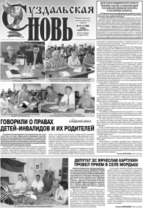 Газета основана 21 марта 1918 г. № 47 (11588) среда, 1 июля 2015 г. Общественно политическая газета В администрации Суздальского района прошел «круглый стол» на тему «Права детей-инвалидов и детей с ограниченными возможностями здоровья, их родителей. Социальная реабилитация и адаптация детей с ограниченными возможностями здоровья и детей-инвалидов». Организовали мероприятие специалисты управления образования районной администрации. В конференц-зале собрались родители детей-инвалидов, руководители образовательных организаций Суздальского района, представители Фонда социального страхования, соцзащиты, специалисты управления образования. Открыла мероприятие О.Р. Богданова, начальник управления образования. Она подробно рассказала о правах детей-инвалидов и детей с ограниченными возможностями здоровья в соответствии с Федеральным законом № 273-ФЗ от 29.12.2012 года «Об образовании в Российской Федерации». Она поблагодарила присутствующих в зале молодых мам за их настойчивость, терпение, за то, что не опускают руки перед трудностями в воспитании и образовании своих детей и предложила им помощь и содействие. О предоставлении мер социальной поддержки семьям, воспитывающим ребенка-инвалида, о социальной реабилитации детей-инвалидов информировала присутствующих И.Е. Степанова, директор ГКУ ВО «Отдел социальной защиты ГОВОРИЛИ О ПРАВАХ ДЕТЕЙ-ИНВАЛИДОВ И ИХ РОДИТЕЛЕЙ «Круглый стол» 23 июня в общественной приемной местного отделения Партии «ЕДИНАЯ РОССИЯ» состоялся выездной прием граждан. Депутат Законодательного Собрания Владимирской области В. Картухин принимал жителей Суздальского района в селе Мордыш. Вместе с ним на приеме были глава Павловского сельского поселения О.Гусева, директор МБУ «Дирекция единого заказчика» А. Бобков, директор ФОКа в с. Павловское, депутат районного Совета народных депутатов А. Храмов. Местных жителей на приеме было не много. Обозначились две основные проблемы, с которыми они обратились: нужна новая ограда детскому саду и необходимо отремонтировать водопровод в Доме культуры с.Мордыш. В этот раз в Мордыш на прием к депутату ЗС приехали жители других поселений района. Оказалось, что в генплане Новоалександровского сельского поселения отсутствует улица Фермерская в селе Новгородское, отсюда ряд неприятностей у местных жителей. За помощью приехали и жильцы многоквартирного дома на ул. Пожарского в Суздале. В 2013 году жители дома на общем собрании отказались от услуг управляющих компаний и решили перейти на непосредственное управление домом. За короткое время на свои средства отремонтировали крышу, сделали новые водостоки, произвели ремонт водопровода и канализации. А сейчас им приходят платежки за капитальный ремонт. Жильцы этого многоквартирного дома добиваются, чтобы им зачли потраченные на ремонт дома деньги в счет платы за капитальный ремонт. Но пока во всех инстанциях, куда они обращались, им отказывают. Конечно, вопросы сложные и скоро их не решить. Однако, В. Картухин обещал свою помощь и содействие. После приема в Мордыше, депутат ЗС отправился в Порецкое, где он вел прием месяц назад, чтобы проверить, какие из вопросов решены за это время. Галина АЛЕКСЕЕВА. Фото автора. населения по Суздальскому району». Отрадно отметить, что все родители детей-инвалидов – участники «круглого стола» этими м