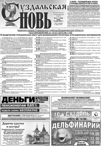 Газета основана 21 марта 1918 г. № 51 (11592) среда, 15 июля 2015 г. Общественно политическая газета НАЧАЛО ПРЕДСТАВЛЕНИЙ: БУДНИЕ ДНИ с 10 июля г. СУЗДАЛЬ ВЫХОДНЫЕ 19.00 12.00 18.00 понедельник – выходной ДЕТИ ДО 5 ЛЕТ - БЕСПЛАТНО (4922) 60-14-94 Реклама ( ) В соответствии с п. 7 ст. 54 Федерального закона от 12.06.2002 67-ФЗ «Об основных гарантиях избирательных и права на участие в референдуме граждан Российской Федерации, п.7 ст. 50 Закона Владимирской области от 13.02.2003 № 10-ОЗ «Избирательный кодекс Владимирской области» и по предложению Территориальной избирательной комиссии Суздальского района, на которую возложены полномочия избирательной комиссии муниципального образования Суздальский район постановляю: 1. Выделить специальные места для размещения печатных агитационных материалов на территории каждого избирательного участка муниципального образования Суздальский район: МУНИЦИПАЛЬНОЕ ОБРАЗОВАНИЕ ГОРОДСКОЕ ПОСЕЛЕНИЕ ГОРОД СУЗДАЛЬ № 337 доска объявлений около магазина по ул. Колхозная, щит между домами № 71 и № 73 по ул.Михайловская; № 338 щит около продуктового магазина по ул. Ленина д. 25, доска объявлений ул. Толстого, магазин «Суздаль», доска объявлений между домами 46 и 48 по ул. Ленина; № 339 рекламный щит на улице Лоунская; № 340 щит напротив Торговых рядов, рекламный щит на ул. Ленина, между домами № 96 и № 98. № 341 щиты у магазинов «Продукты» на бульваре Всполье дома № 4-а и № 15-а; № 342 щит на здании, расположенном по адресу: ул. Советская, д. 38. МУНИЦИПАЛЬНОЕ ОБРАЗОВАНИЕ БОГОЛЮБОВСКОЕ СЕЛЬСКОЕ ПОСЕЛЕНИЕ № 299 доска объявлений у детского сада № 2, п. Боголюбово, доска объявлений у магазина «Минимаркет» ул. Пушкина, д. № 2-а, п. Боголюбово; № 300 доска объявлений по ул. Ленина на д. № 44, п.Боголюбово, доска объявлений по ул. Ленина д. № 55, п. Боголюбово; № 301 доска объявлений на магазине по ул. Огурцова, д. № 25 в с. Добрынское; № 302 доска объявлений на магазине по ул. Нижней, д. № 30 «а» в с. Лемешки; № 303 доска объявлений на магазине по ул. Северной, д. № 1 «а» в д. Раменье; № 304 доска объявлений в п. Сокол; № 305 доска объявлений около магазина ИП «Чайковская» по ул. Центральной, д. № 47, с. Новое; доска объявлений около магазина ИП «Чайковская» по ул. Центральной, д. № 100 с. Новое; № 306 щит на здании библиотеки в с. Суромна; № 307 доска объявлений на магазине ИП «Чайковская» в с. Ославское. МУНИЦИПАЛЬНОЕ ОБРАЗОВАНИЕ НОВОАЛЕКСАНДРОВСКОЕ СЕЛЬСКОЕ ПОСЕЛЕНИЕ № 308 щит на магазине № 29 в с. Клементьево; № 309 доска объявлений на здании администрации муниципального образования Новоалександровское сельское поселение; № 310 доска объявлений на магазине по ул. Центральной, с. Кутуково; № 311 доска объявлений на здании Дома культуры с. Сновицы; № 312 доска объявлений на магазине в с. Богослово; № 313 доска объявлений на магазине в д. Зелени; № 314 доска объявлений на магазине в п. Содышка; № 315 доска объявлений на магазине «Продукты» по ул. Центральной, д. № 10 в с. Старый Двор; доска объявлений на магазине «Продукты» по ул. Дорожной, д. № 35 в с. Обращиха; щит на магазине в п. Малининский; № 316 доска объявлений на магазине по ул. Центральной, д. № 20 в с. Цибеево; доска объявлений на магазине «Продукты» по ул. Покровской, д. № 6, с. Новокаменское. МУНИЦИПАЛЬНОЕ ОБРАЗОВАНИЕ ПАВЛОВСКОЕ № 317 доска объявлений около магазина «Спарта плюс» в с. Павловское; доска объявлений около магазина «Алекс», с. Павловское; доска объявлений около дет