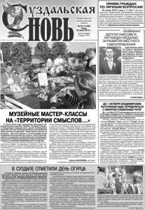 Газета основана 21 марта 1918 г. № 53 (11594) среда, 22 июля 2015 г. Общественно политическая газета 18 июля в Суздале прошел XV Международный Праздник Огурца. В нем приняло участие около 16 тысяч гостей. Центром праздничных мероприятий традиционно стал Музей деревянного зодчества. «День Огурца в настоящее время является главным событийным праздником в Суздале, самым массовым. Сейчас определяется не только концепция празднования 1000-летия Суздаля, но и концепция развития города. Очень важно, чтобы, сохранив свою уникальность, Суздаль, бриллиант на Золотом кольце России, стал современным и комфортным», - отметил заместитель Губернатора Михаил Колков. Инициатор Праздника Огурца – Почетный президент Владимиро-Суздальского музея-заповедника, советник Губернатора Алиса Аксенова подчеркнула: «Сегодня мы можем констатировать - праздник удался! Из года в год он становится все ярче, интереснее и притягательнее для гостей». «День Огурца «раскручен» и не нуждается в рекламе. С другой стороны, статус обязывает проводить его на самом высоком уровне», - отметила генеральный директор Владимиро-Суздальского музея-заповедника Светлана Мельникова. На нескольких площадках праздника выступали музыкальные коллективы и исполнители. Среди них – суздальский певец Артур Фирсов, духовой оркестр из Ставрово, ансамбль «Кристалл» из Иваново, владимирские фолкгруппы «Колокол» и «Мужики». Одновременно бойко торговали изделиями народных промыслов, сувенирами и яствами из огурца. Помимо традиционных малосольных огурцов суздальские умельцы предлагали фаршированные и запеченные огурцы, рулеты из огурцов и даже огуречное варенье. Кроме того, на территории Музея проходили мастерклассы по изготовлению куклы-оберега Акилы-Огуречника и по художественной резьбе по овощам, работал фотосалон «На память – с Огурцом», проводились старинные русские забавы. Для маленьких участников Дня Огурца была подготовлена обширная развлекательная программа – игры, аттракционы, аквагрим, кукольное представление и многое другое. Кульминацией праздника стал традиционный запуск в небо на воздушном шаре гигантской куклы Огурца. В её кармашке было спрятано письмо-инструкция для получения солидного приза для счастливчика, который найдет эту куклу. Ну а подарком для всех участников Праздника Огурца-2015 стало выступление специального гостя - легендарной группы Стаса Намина «Цветы». Фото В. Едунова. 17 июля 2015 года сотрудники Культурно-образовательного центра «Палаты» Государственного Владимиро-Суздальского музея-заповедника приняли участие во Всероссийском молодёжном образовательном форуме «Территория смыслов на Клязьме». Для участников и гостей форума были проведены четыре мастер-класса, на которых музейные сотрудники познакомили всех желающих с процессом создания традиционной русской куклыскрутки на примере Владимирской столбушки. Участники мастер-классов своими руками изготовили куклу-оберег на здоровье и любовь, а также музейный сувенир на память о Владимирской земле, познакомились с историей и символикой владимирской куклы-столбушки. Как основу для Владимирской столбушки при её изготовлении мы использовали берестяной столбик. Всем известны целебные свойства берёзы, что объясняет, по мнению наших предков, оздоровительную обережную силу куклы. Особенно произвёл в