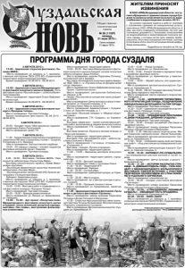 Газета основана 21 марта 1918 г. № 56 (11597) пятница, 31 июля 2015 г. Общественно политическая газета ПРОГРАММА ДНЯ ГОРОДА СУЗДАЛЯ 3 АВГУСТА 2015 г. 12.00 - Церемония открытия фестиваля «Человек МИРА». Место проведения: ул. Шмидта, д. 1, производственные мастерские ГБОУ СПО ВО «Суздальский гуманитарно-индустриальный колледж». Время проведения: 03.08.2015 - 09.08.2015. 4 АВГУСТА 2015 г. 16.00 – Церемония открытия Международного фестиваля лоскутного шитья в Суздале. Гость фестиваля группа «Русский акцент», солистка Валентина Смирнова. Место проведения: территория Спасо-Евфимиева монастыря. Время проведения: 04.08.2015 - 09.08.2015. 5 АВГУСТА 2015 г. 11.00 – Церемония открытия фестиваля-конкурса «Праздник топора». Место проведения: Торговая площадь. Время проведения фестиваля: 05.08.2015 - 08.08.2015. 6 АВГУСТА 2015 г. 20.00 – Концерт-показ «Мое закулисье» художника-модельера Елены Лопатухиной. Место проведения: фойе ГТК. 7 АВГУСТА 2015 г. 11.00 – Торжественное открытие восстановленных памятников XIX века (городскому голове г. Суздаля) П.И.Белову и С.С. Жинкину. Место проведения: Златоустовское кладбище. 19.00 - «От сердца к сердцу» - концерт лауреатов фестиваля авторской песни г. Иваново. Место проведения: Торговая площадь. 8 АВГУСТА 2015 г. 8.00 – 22.00 – Фестиваль «Человек МИРА»: Парк скульптур лаборатории «Скульпторы Мира». Выставка экологического проекта «Ковер Мира» (ковры-кругляши). Экспозиция керамических скульптур творческой лаборатории «Гончары Мира». Экспозиция ретро-автомобилей УАЗ-буханок автопробега «Путешествие Мира». Лабиринт «Березовая роща». Место проведения: ул. Шмидта, д. 1, производственные мастерские ГБОУ СПО ВО «Суздальский гуманитарно-индустриальный колледж». 10.00 - 12.00 – Выставка работ и подведение итогов фестиваля-конкурса «Праздник Топора». Место проведения: Торговая площадь. 10.00 – 18.00 – Ярмарка ремесленников. Место проведения: ул. Ленина, ул. Кремлевская, ул. Лебедева. 10.00 – 15.00 – Арт-проект «Лоскутное поле» Международного фестиваля лоскутного шитья в Суздале: показ коллекций авторской одежды, выставка «Час славы», выступление фольклорных коллективов. Место проведения: территория кремля. 10.00 – 20.00 – Выставки Международного фестиваля лоскутного шитья в Суздале: лучшие лоскутные работы конкурса «Душа России». Место проведения: церковь Параскевы Пятницы, выставочный зал в Зарядье. Выставки «Антикварные лоскутные одеяла Америки 1820-1930 гг.» и «Русские ситцы из фондов музея ситца г.Иваново». Место проведения: Спасо-Евфимиев монастырь. Проект «Тряпичные куклы». Место проведения: центральная библиотека, ул. Ленина, д.78. Проект «Ностальгия по ситцам или ткани, рожденные в СССР». Место проведения: Центр культуры и досуга города Суздаля, ул. Красная площадь, д. 5. Фотовыставка «Мир из лоскутков». Место проведения: Администрация г. Суздаля, 2 этаж, ул. Красная площадь, д. 1. Выставки «Японский печворк» и «Модная лоскутная сумка». Место проведения: ГТК «Суздаль», ул. Коровники, д. 45. Выставка «Шире круг» - проект коллективных детских работ, выполненных в технике лоскутного шитья. Место проведения: ГТК «Суздаль», ул. Коровники, д. 45. Выставка проектов «Палатка в технике печворк» и «Чехол для машины». Место проведения: территория кремля. Выставка «Там, где рождается утро» - работы мастериц Сахалина и Якутии. Место проведения: гостиница «Стромынка», ул. Стромынка, 2. Выставка - конкурс «Пугало огородное». 