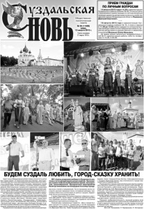 Газета основана 21 марта 1918 г. № 59 (11600) среда, 12 августа 2015 г. Общественно политическая газета ПРИЕМ ГРАЖДАН ПО ЛИЧНЫМ ВОПРОСАМ 14 августа 2015 года в 14.30 в администрации Суздальского района (кабинет № 38, 3 этаж) встречу с населением и прием граждан по личным вопросам проводит директор департамента лесного хозяйства администрации Владимирской области Перминов Дмитрий Сергеевич. * * * 18 августа 2015 года в администрации Суздальского района (кабинет № 18, 2 этаж) в период с 11.00 до 13.00 прием граждан по личным вопросам проводит заместитель Губернатора области, директор департамента имущественных и земельных отношений Мазанько Елена Ивановна. На прием можно записаться предварительно в каб.№ 21 администрации района, либо по телефонам: 2-13-45, 2-30-09. Один только Международный фестиваль лоскутного шитья был представлен 12 тематическими выставками, многочисленными мастер-классами ведущих мастериц квилтинга России и зарубежья, конкурсными показами, ярмарками тканей и авторских работ. В его рамках с успехом прошел концертдефиле «Мое закулисье» суздальского художника- модельера Елены Лопатухиной. Суздальские мастерицы лоскутного шитья из студии «Добродея» под руководством Альбины Болотовой заняли II место среди более, чем 200 участниц фестиваля. На Торговой площади 7 дней лучшие плотники и скульпторы по дереву с утра до позднего вечера показывали свое умение и волшебный процесс превращения обычного бревна в сказочных героев. Фестиваль «Человек мира» представил проекты «Скульпторы мира», «Гончары мира», «Ковер мира», экспозицию ретро-автомобилей УАЗ-буханок автопробега «Путешествие мира», фотовыставку Геннадия Попова. У памятника нашему земляку поэту-маринисту Алексею Лебедеву прошла традиционная встреча поэтов и музыкантов. Праздничная атмосфера города была наполнена мелодиями всех стилей и направлений. Гости праздника могли послушать русские народные песни, эстрадные мелодии, программы известных коллективов из разных городов, бардовские песни в исполнении авторов. У храма Параскевы Пятницы в Заречье собрались участники фестиваля «Гусли мира». Старинные русские распевы под переборы исконно народного инструмента постоянно привлекали зрителей всех возрастов. Главный день праздничных торжеств – День города Суздаля прошел 8-го августа. Суздальцев и гостей праздника поздравили заместитель Губернатора Владимирской области Дмитрий Хвостов, Глава Суздальского района Алексей Сараев, глава г. Суздаля Игорь Кехтер, глава администрации г. Суздаля Александр Разов, мэр итальянского города-партнера Клеса Роджеро Муччи. Руководители города отметили большую группу суздальцев и вручили грамоты и памятные призы спортсменам, депутатам Горсовета, работникам музея-заповедника. Лауреатами премии им. А.Д. Варганова в 2015 году стали суздальский поэт, член Союза писателей России Анатолий Евсеенко и краевед, издатель, коллекционер-исследователь Валерий Машковцев. Заслуженные награды получили также победители фестиваля-конкурса «Праздник топора». В рамках Дня города прошел Международный фольклорный фестиваль «Святой источник». Радушие, доброжелательность, высокий уровень всех праздничных мероприятий, красочное костюмированное шествие в единой колонне жителей и гостей города останутся в сердцах всех, побывавших в древнем Суздале в эти прекрасны