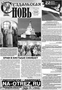 Газета основана 21 марта 1918 г. № 62 (11603) пятница, 21 августа 2015 г. Общественно политическая газета NA-OTREZ.RU ЛИНОЛЕУМ - ЛАМИНАТ НАПОЛЬНЫЕ ПОКРЫТИЯ ОПТОМ И В РОЗНИЦУ Наш адрес: г.Владимир, ул. Мира, д. 53 (ост. ДК Молодежи) Тел. 8 915 777 64 89. ПРЕДЪЯВИТЕЛЮ КУПОНА СКИДКА 10% Реклама УВАЖАЕМЫЕ ЖИТЕЛИ ВЛАДИМИРСКОЙ ОБЛАСТИ! Сердечно поздравляю вас с Днем Государственного флага Российской Федерации! Российский триколор вновь стал одним из важнейших государственных символов нашей страны в августе 1991 года. Он символизирует преемственность поколений, объединяет многонациональный народ сильной и независимой России. История бело-сине-красного флага уходит в глубину веков, овеянных ратной и трудовой славой сынов и дочерей Отечества. Достойное место в их когорте занимают жители и Владимирской земли. Впервые триколор был поднят на российском военном корабле «Орел», во времена царствования Алексея Михайловича. Однако государственным флагом он стал при Петре I. Белый цвет стяга означал благородство, синий – честность, а красный – смелость и великодушие, присущее россиянам. Дорогие земляки! Сегодня мы вместе создаем новую историю нашей страны под трехцветным флагом – символом патриотизма и веры в Отечество. Именно эти качества во все времена помогали нам побеждать. Пусть наши дети вырастут достойными гражданами страны. Пусть всегда в наших сердцах живет чувство гордости за Россию! В этот праздничный день желаю вам счастья, мира, здоровья, благополучия и успехов! С.Ю. ОРЛОВА, Губернатор Владимирской области. На службу в этот субботний солнечный день собралось много народу. Приехали из Суздаля, Владимира, Москвы, местные жители из Гавриловского, Веси, Вишенок, Янева, Романова. Приехала на службу Ольга Николаевна Куликовская-Романова - одна из членов Императорского Дома Романовых (сама она сейчас живет в Канаде, ей далеко за восемьдесят). Атмосфера в храме была благостной, умиротворенной. Под куполом порхали птички, пел церковный хор. Владыка Евлогий, как всегда, говорил о человеколюбии, смирении, помощи обездоленным, любви к Всевышнему. Он отметил также как изменился облик храма, как он оживает буквально на глазах. Да и прихожане не могли этого не заметить. В алтаре сделаны проводка, пол, завершена отделка. Уложен пол и в самом храме.Об интересных фактах поведал генерал-майор А.В. Черкасов, руководитель фонда «Омофор», один из тех, кто вкладывает всю душу в восстановление храма, свято почитает имя великого русского полководца Александра Суворова. Оказывается, когда вскрыли пол в церкви, там обнаружили плиты примерно 18 века, по которым ходил сам Суворов. Их очистили, привели в порядок и выложили ими пол в алтаре и положили перед входом в храм и около окон. Просил А.В.Черкасов выразить благодарность людям, которые принесли иконы в дар храму. Особенно - Тамаре Борисовне Панфиловой, чья бабушка была когда-то церковным старостой здесь и не допустила поругания этого святого места, спрятав ключи от церкви, и понесла потом за это наказание. Подаренная ей икона - старинного письма и предположительно была написана специально для этогого храма в Кистыше. Прихожанами были сделаны пожертвования, т.к. храм восстанавливается на благотворительной основе. «Слава Богу,- говорит А.В.Черкасов, - что люди жертвуют, помогают храму, приезжают сюда принимать участие в субботниках. Все 