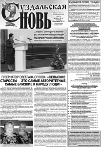 Газета основана 21 марта 1918 г. № 70 (11611) пятница, 18 сентября 2015 г. Общественно политическая газета ИЗБИРАТЕЛЬНАЯ КОМИССИЯ МУНИЦИПАЛЬНОГО ОБРАЗОВАНИЯ ГОРОДСКОЕ ПОСЕЛЕНИЕ ГОРОД СУЗДАЛЬ ПОСТАНОВЛЕНИЕ 15.09.2015 № 105 Об установлении общих результатов выборов депутатов Совета народных депутатов муниципального образования городское поселение город Суздаль Суздальского района третьего созыва 13 сентября 2015 года В соответствии со статьями 15 и 101 Закона Владимирской области от 13.02.2003 № 10-ОЗ «Избирательный кодекс Владимирской области», на основании протоколов Избирательной комиссии муниципального образования городское поселение город Суздаль, на которую возложены полномочия окружных избирательных комиссий, об определении результатов выборов по одномандатным избирательным округам Избирательная комиссия муниципального образования городское поселение город Суздаль постановляет: 1. Признать выборы депутатов Совета народных депутатов муниципального образования городское поселение город Суздаль Суздальского района третьего созыва 13 сентября 2015 года состоявшимися и действительными. 2. Установить, что в Совет народных депутатов муниципального образования городское поселение город Суздаль Суздальского района третьего созыва избрано 15 депутатов по одномандатным избирательным округам (список избранных депутатов прилагается). 3. Опубликовать настоящее постановление в средствах массовой информации, разместить на официальном сайте органов местного самоуправления города Суздаля в сети «Интернет», а также направить настоящее постановление в Совет народных депутатов муниципального образования городское поселение город Суздаль Суздальского района. А.Ю. СОЛОВЬЕВА, председатель избирательной комиссии. Е.В. АНТОНОВА, секретарь избирательной комиссии. Приложение к Постановлению Избирательной комиссии муниципального образования городское поселение город Суздаль от 15.09.2015 № 105 СПИСОК избранных депутатов Совета народных депутатов муниципального образования городское поселение город Суздаль Суздальского района По одномандатным избирательным округам Одномандатный избирательный округ № 1 1. Майорова Лариса Владимировна Одномандатный избирательный округ № 2 2. Петрова Асия Мирьякуповна Одномандатный избирательный округ № 3 3. Курашкина Ольга Валерьевна Одномандатный избирательный округ № 4 4. Кехтер Игорь Эрикович Одномандатный избирательный округ № 5 5. Журавлёв Эдуард Евгеньевич Одномандатный избирательный округ № 6 6. Белов Александр Юрьевич Одномандатный избирательный округ № 7 7. Ландышева Людмила Някибовна Одномандатный избирательный округ № 8 8. Кашенков Сергей Вячеславович Одномандатный избирательный округ № 9 9. Кузин Алексей Юрьевич Одномандатный избирательный округ № 10 10. Родионов Сергей Юрьевич Одномандатный избирательный округ № 11 11. Шалилов Александр Вячеславович Одномандатный избирательный округ № 12 12. Пташук Анатолий Федорович Одномандатный избирательный округ № 13 13. Большаков Максим Александрович Одномандатный избирательный округ № 14 14. Горшкова Любовь Яковлевна Одномандатный избирательный округ № 15 15. Сидорова Светлана Ивановна УВАЖАЕМЫЕ ЖИТЕЛИ ГОРОДА СУЗДАЛЯ! Администрация города Суздаля напоминает, что 1 октября текущего года истекает срок уплаты по налогам (земельный, транспортный и налог на и