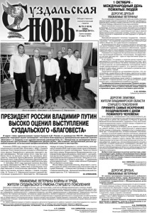 Газета основана 21 марта 1918 г. № 73 (11614) среда, 30 сентября 2015 г. Общественно политическая газета Начиная с 2009 года, каждое лето часть состава муниципального коллектива «Благовест» ЦКД г. Суздаля проводит благотворительные концерты в Императорском дворце Ливадийского дворцово-паркового музея-заповедника. Летний сезон этого года был особенно богат на высоких гостей. На концертах «Благовеста» побывали Никита Михалков, Иосиф Кобзон, Великий князь глава Дома Романовых Дмитрий Романов и другие известные политики и деятели культуры. 11 сентября 2015 года мужская капелла выступила перед Президентом РФ В. Путиным и его гостем Сильвио Берлускони, известным итальянским государственным и политическим деятелем. После концерта состоялась встреча певцов с главой государства. В. Путин и С. Берлускони высоко оценили выступление суздальского «Благовеста». Вспоминали первую встречу Президента с коллективом, прошедшую 6 января 2004 года в Крестовой палате Владимиро-Суздальского музея-заповедника. Также состоялся разговор между Владимиром Владимировичем и руководителем мужской капеллы «Благовест», заслуженным артистом России Л.Г. Панкратовым о путях развития академической музыки в России. Шла речь и о совместных проектах в области культуры. «С уважением и благодарностью!» - такие слова написал Президент РФ на буклете коллектива. 29 сентября у мужской капеллы «Благовест» состоялось одно из самых значимых событий за все годы ее существования – сольное выступление в самом престижном зале России – Большом зале Московской консерватории им. П.И. Чайковского. Ш.АЛМАКАЕВ. ПРЕЗИДЕНТ РОССИИ ВЛАДИМИР ПУТИН ВЫСОКО ОЦЕНИЛ ВЫСТУПЛЕНИЕ СУЗДАЛЬСКОГО «БЛАГОВЕСТА» В адрес главы администрации города Суздаля А.В. Разова от руководства ГБУ РК «Ливадийский дворцово-парковый музей-заповедник» поступила Благодарность муниципальной мужской капелле «Благовест» (г.Суздаль) и ее художественному руководителю Л.Г. Панкратову за проведение благотворительных выступлений в Ливадийском дворце-музее, обогативших экскурсионный рассказ духовной музыкой, за их высокий профессионализм, большой талант и мастерство. 1 ОКТЯБРЯ - МЕЖДУНАРОДНЫЙ ДЕНЬ ПОЖИЛЫХ ЛЮДЕЙ ДОРОГИЕ ДРУЗЬЯ! УВАЖАЕМЫЕ ВЕТЕРАНЫ! По сложившейся традиции в этот день мы особо отмечаем заслуги людей старшего поколения. В текущем году Международный день пожилых людей отмечается в год празднования 70-летия Победы в Великой Отечественной войне. Ваше поколение показало всему миру пример мужества и героизма, истинного патриотизма, беззаветного служения Родине. Ратные и трудовые заслуги помогли одержать Великую Победу, а энтузиазм и самоотверженный труд в мирное время воплотились в великие стройки, полёты в космос, научные открытия и свершения во имя будущего и процветания Отчизны. Важнейший приоритет политики государства - повышение качества жизни граждан, а отношение к людям старшего поколения – это индикатор социальной ответственности для любого общества, его нравственного измерения. Во Владимирской области немало делается для улучшения жизни пожилых людей. Совершенствуется система мер социальной поддержки, пенсионного обеспечения, здравоохранения, растет число предоставляемых социальных услуг, совершенствуются новые формы социального обслуживания. Развивается сотрудничество органов власти и о