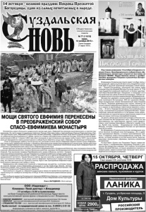 Газета основана 21 марта 1918 г. № 77 (11618) среда, 14 октября 2015 г. Общественно политическая газета Реклама Под таким названием 14 октября в Суздале в галерее Спасо-Преображенского собора Спасо-Евфимиевского монастыря откроется выставка из фондов ГВСМЗ. Представлены иконы с изображением праздника Покрова и различных Богородичных изводов. Владимиро-Суздальская земля имеет особую связь с Богородицей. Здесь ещё в XII веке князь Андрей Боголюбский ввёл в русский церковный календарь новый праздник – Покров Богородицы, обозначив тем самым идею покровительства Божией Матери Русской земле. В 1155 году Андрей Боголюбский переносит из Киева чудотворный образ Божией Матери «Умиление» и помещает его в построенный им собор Успения Богородицы. Глубоко почитаемая икона получила наименование «Владимирской». Множество церквей и монастырей во Владимирском крае посвящено Богородице. 850 лет украшает Владимиро-Суздальскую землю белокаменный храм Покрова на Нерли. Творение древнерусских зодчих «является не только самым совершенным храмом, созданным на Руси, но и одним из величайших памятников мирового искусства…» В честь Покрова Богородицы был освящён монастырь, основанный в Суздале в середине XIV века. Торжественный, величественный и в то же время очень лиричный комплекс его архитектурных памятников славится как один из самых поэтичных ансамблей Суздаля. За десять веков христианской культуры в России создано множество Богородичных икон. Некоторые из них прославились как чудотворные, другие стали свидетелями и участниками важнейших событий в судьбе страны. Яркий тому пример – Владимирская икона Божией Матери, которая сопровождала Россию на протяжении всей её истории. Во Владимиро-Суздальском музее-заповеднике хранится богатая коллекция икон Богородицы. Это и древние чудотворные образы, и списки прославленных святынь, и образцы новых иконографических сюжетов. Это иконы, которые входили в состав иконостасов, были домашними «моленными» образами, являлись семейными реликвиями. На выставке «Осени нас Покровом Твоим» представлены иконы с изображением праздника Покрова и различных Богородичных изводов. Это глубоко почитаемые образы Божией Матери, которые непременно имелись в каждом доме, храме и монастыре. Большая часть произведений экспонируется впервые. 14 октября - великий праздник Покрова Пресвятой Богородицы, один из самых почитаемых в народе. Основатель самого большого суздальского монастыря преп. Евфимий был великим молитвенником и строгим подвижником. Он часто ходил за духовным советом в Троице-Сергиеву лавру к преподобному Сергию Радонежскому. Святой чудотворец преп. Евфимий Суздальский своими деяниями, подвижничеством, всей многотрудной жизнью является символом высокой духовности, добра, милости к людям и беззаветному служению Господу. Скончался святой Евфимий в возрасте 88 лет 1 апреля 1404 года и был похоронен в приготовленном им самим гробу. 4 июля 1507г. при копании рвов для фундамента нового монастырского собора были обретены мощи преп. Евфимия, объявленные нетленными. ...И вот в прошедшую субботу после долгих лет скитаний останки святого Евфимия обрели покой в Спасо-Евфимиевом монастыре. Церемония началась с молебна в Вознесенском храме Александровского монастыря. Затем крестным ходом, торжественным и многолюдным, под ко