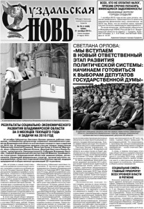 Газета основана 21 марта 1918 г. № 79 (11620) среда, 21 октября 2015 г. Общественно политическая газета ВСЕХ, КТО НЕ ОПЛАТИЛ НАЛОГ, ПРОСИМ СРОЧНО ПОГАСИТЬ ИМЕЮЩУЮСЯ ЗАДОЛЖЕННОСТЬ! УВАЖАЕМЫЕ ЖИТЕЛИ ГОРОДА СУЗДАЛЯ! 1 октября 2015 года истек срок уплаты налогов (земельного, транспортного и налога на имущество физических лиц), начисленных за 2014 год. Всех, кто не оплатил налог, просим срочно погасить имеющуюся задолженность. По всем вопросам необходимо обратиться в Межрайонную ИФНС России № 6 по Владимирской области по адресу: г. Суздаль, Красная площадь, д.1, 3-й этаж, контактный телефон 2-12-61. Администрация города Суздаля. «Мы вступаем в новый ответственный этап развития политической системы: начинаем готовиться к выборам депутатов Государственной Думы, которые должны продемонстрировать конкурентность, открытость и легитимность. Мы собрались для того, чтобы «сверить часы» и обменяться мнениями о путях дальнейшего развития Владимирской области, - обратилась к лидерам общественного мнения Светлана Орлова. - В течение двух с половиной лет мы стараемся решать системные проблемы инвестиционной привлекательности и улучшения делового климата региона. Благодаря слаженной и упорной работе наблюдается динамичный рост основных экономических показателей». В этом году общий оборот предприятий по всем видам экономической деятельности увеличился на 9,9 процента и составил 508,6 млрд. рублей. Индекс промышленного производства за этот период - 112,4 процента. Позитивные показатели в экономике в свою очередь обеспечили стабильные налоговые поступления. В частности доходы консолидированного бюджета Владимирской области за 9 месяцев 2015 года превысили 41 млрд. рублей (в сравнении с аналогичным периодом прошлого года рост составил 7,2 процента). Позитивные изменения экономики характеризуются также ростом налоговых поступлений в бюджет: налога на прибыль организаций в этом году собрано почти на 2 процента больше - 6,9 млрд. рублей. Благодаря притоку инвестиций увеличиваются и имущественные налоговые доходы. «Приоритетом для нас остаётся финансовое обеспечение «майских» Указов Президента России Владимира Путина. Только в этом году на эти цели направлено 12,9 миллиардов рублей, - сообщила глава региона. - Конечно, мы отчётливо понимаем, что завершение года пройдет в крайне сложных условиях. Новые экономические реалии не позволяют рассчитывать на дополнительные доходы. Бюджет будет жёстким. В этих условиСВЕТЛАНА ОРЛОВА: «МЫ ВСТУПАЕМ В НОВЫЙ ОТВЕТСТВЕННЫЙ ЭТАП РАЗВИТИЯ ПОЛИТИЧЕСКОЙ СИСТЕМЫ: НАЧИНАЕМ ГОТОВИТЬСЯ К ВЫБОРАМ ДЕПУТАТОВ ГОСУДАРСТВЕННОЙ ДУМЫ» 16 октября Губернатор Светлана Орлова провела рабочее совещание, посвященное результатам социально-экономического развития Владимирской области за 9 месяцев текущего года и задачам на 2016 год. В мероприятии приняли участие первые заместители Губернатора Алексей Конышев, Вячеслав Кузин и Алексей Марченко, вице-губернаторы Михаил Колков, Дмитрий Хвостов и Роман Русанов, председатель Законодательного Собрания Владимир Киселёв, главный федеральный инспектор Сергей Мамеев, руководители структурных подразделений областной администрации, региональных управлений федеральных структур, органов местного самоуправления, областных отделений политических партий, ведущих предприятий и общественных организаций 33-го ре