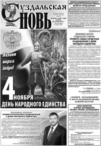 Газета основана 21 марта 1918 г. № 82-83 (11623-11624) пятница, 30 октября 2015 г. Общественно политическая газета УВАЖАЕМЫЕ ЗЕМЛЯКИ! ПРИМИТЕ ИСКРЕННИЕ ПОЗДРАВЛЕНИЯ С ДНЕМ НАРОДНОГО ЕДИНСТВА! В этот день мы вспоминаем подвиг наших предков, ставших единой стеной на защиту Отечества. В 1612 году люди разных сословий и национальностей под предводительством земского старосты Кузьмы Минина и потомка Владимиро-Суздальских князей Дмитрия Пожарского создали народное ополчение и освободили Москву от польских интервентов, сохранив независимость нашего государства. Уроки прошлого показывают нам, что мы – великая держава, а славные подвиги сынов нашего Отечества подтверждают справедливость слов Александра Невского: «Кто с мечом к нам придет, от меча и погибнет». Вера в свои силы, самоотверженность, патриотизм нашего народа являются прочным фундаментом для развития нашей Родины. В этот праздник желаю вам, дорогие земляки, крепкого здоровья, добра, семейного счастья и благополучия! С уважением, Григорий Аникеев, депутат Государственной Думы РФ, председатель ВПОО «Милосердие и порядок». 4НОЯБРЯ ДЕНЬ НАРОДНОГО ЕДИНСТВА Желаем мира и добра! УВАЖАЕМЫЕ ЖИТЕЛИ СУЗДАЛЬСКОГО РАЙОНА! ПРИМИТЕ САМЫЕ СЕРДЕЧНЫЕ ПОЗДРАВЛЕНИЯ С ДНЁМ НАРОДНОГО ЕДИНСТВА! Праздник 4 ноября – дань глубокого уважения славному прошлому нашего Отечества и символ веры в его завтрашний день. В самые сложные периоды истории Российского государства его неизменно спасала сплоченность граждан, которые были едины в главном – в стремлении сохранить свободу и независимость нашей Родины, сделать ее сильной и великой державой. В героическом прошлом Родины мы черпаем силу для новых свершений, для равнения на подвиги отцов и дедов. День народного единства неразрывно связан с именем Дмитрия Пожарского, нашего земляка, одного из лидеров народного ополчения. Любовь к Родине, историческая память и нравственное родство соединяют нас с нашими предками. Их мужество, сплоченность, преданность Отчизне и готовность пожертвовать всем ради ее процветания и сегодня являются примерами истинного служения России. При этом единство народа было и остается основой всех побед, одной из самых высоких духовных ценностей нашего государства. Дорогие земляки! Поздравляем вас с национальным праздником – Днём народного единства! Желаем здоровья, счастья, добра и мира, новых свершений во благо нашей любимой Родины! Т.А. СРИБНАЯ, и.о. Главы Суздальского района. В.В. КИРИЛЛОВ, председатель Совета народных депутатов. * * * 4 НОЯБРЯ ПРАЗДНОВАНИЕ В ЧЕСТЬ КАЗАНСКОЙ ИКОНЫ БОЖИЕЙ МАТЕРИ. ЖИТЕЛИ ВЛАДИМИРСКОЙ ОБЛАСТИ МОГУТ ОКАЗАТЬ ПОСИЛЬНУЮ ПОМОЩЬ ДЕТЯМ ИЗ ГОРОДА ДОНЕЦКА Краснодарский региональный общественный фонд «Достоинство» приглашает жителей Владимирской области поучаствовать в сборе благотворительных пожертвований для восстановления школы-интерната I-II ступеней №22 в городе Донецке, которая оказалась разрушена в результате многочисленных артобстрелов. С этой просьбой о помощи в фонд обратилась Инесса Набоева - директор донецкой школы-интерната, в которой обучаются дети-инвалиды с нарушениями опорно-двигательного аппарата. Сотрудники фонда побывали на месте разрушений и приняли решение оказать посильную помощь в реконструкции учебного корпуса: во всех регионах страны объявлен сбор средств на необходимые строй