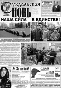 Газета основана 21 марта 1918 г. № 84 (11625) пятница, 6 ноября 2015 г. Общественно политическая газета НАША СИЛА – В ЕДИНСТВЕ! День народного единства – государственный праздник, связанный с историей освобождения Москвы от польских интервентов народным ополчением в 1612 году. Праздник молодой, его начали отмечать с 2005 года. ПОЗДРАВЛЕНИЕ ОТ ПРЕЗИДЕНТА РОССИИ Президент России Владимир Путин поздравил Губернатора Владимирской области с Днем народного единства. «Уважаемая Светлана Юрьевна! Поздравляю Вас и всех жителей Владимирской области с Днем народного единства. Этот праздник уходит своими корнями вглубь веков, знаменует преемственность традиций народного единения и сплоченности, - пишет глава государства. - Сегодня мы отвечаем на сложные вызовы современности, черпая силу в истории России, в делах и заветах наших предков. По праву гордимся их ратными подвигами, трудовыми свершениями, искренним стремлением верой и правдой служить Отечеству. Желаю Вам успехов, здоровья и всего самого доброго!» 4 ноября во Владимире на площади Победы состоялся митинг-концерт, посвященный Дню народного единства. В мероприятии приняли участие Губернатор Светлана Орлова, председатель Законодательного Собрания Владимир Киселёв, главный федеральный инспектор Сергей Мамеев, руководители администраций региона и города Владимира, представители трудовых коллективов, общественных объединений, политический партий, ветераны и молодежь. В этот же день в Суздале, в Спасо-Евфимиевом монастыре возле усыпальницы национального героя, выдающегося русского полководца князя Дмитрия Пожарского состоялись торжественные мероприятия, посвящённые Дню народного единства России. В них приняли участие Губернатор Светлана Орлова, её заместители и руководители структурных подразделений областной администрации, председатель Законодательного Собрания Владимир Киселёв, главный федеральный инспектор Сергей Мамеев, Герой Труда России Алиса Аксёнова, Митрополит Владимирский и Суздальский Евлогий, руководители города Суздаля и Суздальского района, делегация участников IX Ассамблеи Русского мира, заместитель председателя Государственного Совета Республики Крым Андрей Козенко, заместитель председателя Совета Министров Республики Крым Алла Пашкунова, руководители военнопатриотических клубов и организаций Центрального федерального округа, Волгоградской области, города Санкт-Петербурга и Республики Крым – участники молодёжного историко-патриотического форума «Благодарная Россия», жители Суздаля. (Подробности читайте на 2 стр.) Уважаемые жители Суздальского района! МКУ «Управление сельского хозяйства Суздальского района» сообщает, что с целью воспитания экологической культуры у жителей Владимирской области и объединения усилий граждан, организаций и органов власти в деле сохранения природного наследия, в ноябре 2015 года Владимирская область присоединится к проекту «Ресурсосбережение. Всероссийский Эко-марафон ПЕРЕРАБОТКА». СДАЙ МАКУЛАТУРУ! СПАСИ ДЕРЕВО! В целях поддержки акции просим вас принять участие в Эко-марафоне. Безвозмездный прием макулатуры будет производиться 9, 10 и 11 ноября 2015 года с 9.00 до 17.00 по адресу: г. Суздаль, ул. Промышленная, д.5-б (магазин «Стройдом»). Материальные средства от акции будут использованы на проведение экологических мероприя