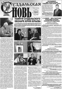 Газета основана 21 марта 1918 г. № 88 (11629) пятница, 20 ноября 2015 г. Общественно политическая газета ВО ВЛАДИМИРЕ ИДЕТ РЕКОНСТРУКЦИЯ СЕМЕЙНОГО КАФЕ-МУЗЕЯ «ГЖЕЛЬ» На Добросельской, 2-г, идет реконструкция семейного кафе-музея «Гжель». Скоро здесь появится еще один зал для детских праздников и новые музейные экспозиции, рассказывающие об удивительном гжельском промысле и знаменитых мастерах. Инициатор проекта - депутат Государственной Думы РФ от Владимирской области Григорий Аникеев. (Подробности на 2 стр.) Ведущей вечера памяти была Алла Савировна Зайкова, директор Суздальского филиала ВСМЗ, председатель Суздальского отделения ВООПИиК. Она рассказала о Юрии Юрьеве тепло и ярко, как человек, много лет знавший его и часто с ним общавшийся. Показала звонкий колокольчик, подаренный ей на память, как и многим друзьям Юрия Юрьевича. Воспоминаниями о начале колокольных звонов в Суздале и работе Ю. Юрьева в музее, где он прослужил почти 30 лет, о знаменитом дуэте звонарей Ю.Юрьев - В.Гаранин поделилась генеральный директор Владимиро-Суздальского музея-заповедника Светлана Мельникова. Свои прекрасные духовные песнопения посвятили другу певчие мужской капеллы «Благовест». Mелодии на темы старых советских кинофильмов, которые так любил Юрий Юрьев, исполнил на скрипке научный сотрудник Владимирского НИИСХ Игорь Винокуров, свои музыкальные композиции на гуслях сыграл звонарь Спасо-Евфимиева монастыря Александр Леонов. Сотрудница музея Маргарита Ломакина, знавшая Юрия Юрьева с первых дней работы в музее, рассказала, каким открытым, приветливым, готовым всем помочь был ее друг. Дитя войны, он, найденный на вокзале совсем маленьким ребенком, всегда помнил добро и отзывался на него всем сердцем. Он часто навещал своих воспитателей из детского дома, суздальских ветеранов. На звоннице его нередко окружали мальчишки из неблагополучных семей, он хотел передать им свою любовь к звонам, научить их настоящему творческому делу. Но тяжел хлеб звонаря – в любую погоду, открытый всем ветрам бьет он каждый час в свои колокола, поднимая души людские в высь от земной суеты и обыденности. На монастырской колокольне в гостях у Юрия Юрьевича побывало множество знаменитых людей – ученые, космонавты, режиссеры, артисты, художники, писатели. Он любил фотографироваться с ними, дважды снимался в кино. Эту сторону его жизни красочно и эмоционально описал заслуженный работник культуры РФ, основатель и редактор культурно-просветительской газеты «Вечерний звон» Юрий Белов. Он также автор уникальных фотографий Юрия Юрьевича на стендах выставки. ПАМЯТИ СУЗДАЛЬСКОГО ЗВОНАРЯ ЮРИЯ ЮРЬЕВА 17 ноября в Крестовой палате кремля прошел вечер памяти первого суздальского звонаря Юрия Юрьевича Юрьева. Сотрудники музея-заповедника подготовили выставку, экспонаты которой рассказывают об этом светлом, дружелюбном и обаятельном человеке. Близкий друг первого суздальского звонаря А.П. Дергоусов, хранитель его коллекций колокольчиков, значков, книг, периодических изданий рассказал о последних днях жизни Ю.Ю. Юрьева. Именно он предоставил его личные вещи для подготовки экспозиции. Прошел год, как ушел из жизни звонарь, гражданин и патриот Суздаля. Он часто приходил в редакцию газеты «Суздальская новь», приносил заметки о жизни города и горожан, рассказывал, где был, что видел. Он ус