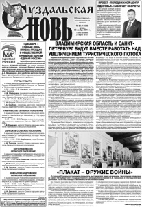 Газета основана 21 марта 1918 г. № 89 (11630) среда, 25 ноября 2015 г. Общественно политическая газета ПРОЕКТ «ПЕРЕДВИЖНОЙ ЦЕНТР ЗДОРОВЬЯ» НАБИРАЕТ ОБОРОТЫ В начале ноября во Владимирской области стартовал новый социальный проект депутата Госдумы Григория АНИКЕЕВА «Передвижной центр здоровья» по оказанию бесплатных медицинских услуг жителям региона. На очередном рабочем совещании депутат подвел итоги работы первой недели проекта и провел приемку второго специализированного комплекса. (Подробности – на 2 стр.) На открытии выставки выступили генеральный директор Владимиро-Суздальского музея-заповедника Светлана Мельникова, директор Суздальского филиала музея Алла Зайкова, директор государственного мемориального музея А.В. Суворова Владимир Гронский. Они говорили об истории создания плаката, о его значении в годы войны. Плакат стал мощным орудием воздействия на сознание людей. Выполненный в жанре народного рисунка, плакат был доступен всем от мала до велика. Яркие образы были понятны каждому. Запоминался короткий энергичный текст-лозунг. Он призывал к действию. Также плакаты размещались в местах наибольшего скопления людей, на специальных щитах, на стенах домов, на площадях и вокзалах. На выставке представлено несколько плакатов творческого объединения ленинградских художников «Боевой карандаш», возникшего еще в советско-финскую войну. А знаменитое творческое объединение художников «Кукрыниксы» (Куприянов, Крылов, Соколов) уже вечером 22 июня 1941 года создало эскиз плаката «Беспощадно разгромим и уничтожим врага». Он также представлен на выставке. Плакаты были обращены к бойцам и командирам Красной Армии с призывом беспощаднее громить врага, освобождать родных и близких. Другие темы плакатов были направлены труженикам тыла, женщинам, заменившим мужчин на оборонных заводах и полях. Эта выставка делает нас, современных людей, не испытавших ужаса войны, сопричастными той великой жертвенной эпохе. Павел ПАРАМОНОВ. Фото автора. В галерее Суздальского кремля открылась выставка под таким названием. Экспозиция привезена из Санкт-Петербургского государственного мемориального музея А.В. Суворова, и ее открытие приурочено к 70-летию Победы в Великой Отечественной войне. «ПЛАКАТ – ОРУЖИЕ ВОЙНЫ» 1 ДЕКАБРЯ – ЕДИНЫЙ ДЕНЬ ПРИЕМА ГРАЖДАН В ОБЩЕСТВЕННОЙ ПРИЕМНОЙ ПАРТИИ «ЕДИНАЯ РОССИЯ» 1 декабря, в день рождения Всероссийской политической Партии «ЕДИНАЯ РОССИЯ», по давно сложившейся традиции, проходит Единый день приема граждан во всех региональных и местных общественных приемных Председателя партии Д.А. Медведева. Для удобства жителей прием будет организован во всех муниципальных образованиях Суздальского района. ГОРОД СУЗДАЛЬ В общественной приемной местного отделения Партии «ЕДИНАЯ РОССИЯ» (г. Суздаль, ул. Ленина, д. 78) будут вести прием граждан: 9.00 – 11.00 – С.В. Сахаров, глава администрации г. Суздаля, Л.В. Майорова, руководитель фракции Партии «ЕДИНАЯ РОССИЯ» Совета народных депутатов г. Суздаля. Запись по тел. 2-10-66; 15.00 - 17.00 – В.Ю. Картухин, депутат Законодательного Собрания Владимирской области, А.П. Сараев, Глава Суздальского района, Т.А. Срибная, секретарь местного отделения Партии «ЕДИНАЯ РОССИЯ». Запись по тел. 2-05-17. ПАВЛОВСКОЕ СЕЛЬСКОЕ ПОСЕЛЕНИЕ В администрации Павловского сельского поселения (с. Павловское, ул. Школьная, д. 17а) б