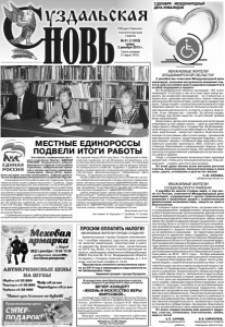 Газета основана 21 марта 1918 г. № 91 (11632) среда, 2 декабря 2015 г. Общественно политическая газета УВАЖАЕМЫЕ ЖИТЕЛИ ВЛАДИМИРСКОЙ ОБЛАСТИ! 3 декабря мы отмечаем Международный день инвалидов, оказывая заслуженное внимание тем, кто в силу состояния своего здоровья нуждается в особой поддержке и защите. Во Владимирской области проживает 148 тысяч инвалидов. И сегодня у нас есть еще один повод выразить им искреннее восхищение – их стойкостью и мужеством, умением противостоять самым тяжелым жизненным обстоятельствам, силой духа и щедростью души. Среди людей с ограниченными возможностями здоровья немало тех, кто достиг больших успехов в общественной деятельности, в спорте, в науке и творчестве. И мы говорим им – спасибо. За личный подвиг, за победу над своим недугом, за достойный пример всем окружающим. Безусловно, делать все возможное для интеграции инвалидов во все сферы жизни – одна из важнейших задач нашего общества и государства. Во Владимирской области эта работа активно ведётся. Многое сделано, ещё больше – предстоит сделать. В регионе реализуется программа «Доступная среда», призванная максимально снизить существующие барьеры, которые мешают людям с особенностями здоровья пользоваться услугами транспорта, ЖКХ, получать качественное образование и медицинскую помощь, быть востребованными на рынке труда, без проблем обращаться в государственные учреждения и в органы власти любого уровня. Люди с ограниченными возможностями здоровья делают всё, чтобы жить полноценной жизнью. Наш общий долг – создать для этого все условия. От всей души желаю всем жителям региона счастья, благополучия, бесконечной веры в свои силы, удачи, оптимизма и долгих лет жизни! С.Ю. ОРЛОВА, губернатор области. 3 ДЕКАБРЯ - МЕЖДУНАРОДНЫЙ ДЕНЬ ИНВАЛИДОВ УВАЖАЕМЫЕ ЖИТЕЛИ СУЗДАЛЬСКОГО РАЙОНА! 3 декабря во многих странах мира, в том числе и в России, отмечается Международный день инвалидов, учрежденный с целью привлечения внимания к проблемам людей с ограниченными физическими возможностями, защите их прав и благополучия. С каждым годом государством, органами местного самоуправления, предприятиями, общественными и благотворительными организациями уделяется всё больше внимания процессу интеграции людей с ограниченными возможностями в различные сферы жизни общества. В работе администрации Суздальского района всегда было и остается приоритетным направление на реабилитацию и всестороннюю помощь людям, находящимся в трудных жизненных обстоятельствах из-за проблем со здоровьем. На территории района реализуются адресные меры поддержки, предусмотренные законодательством Российской Федерации, Владимирской области и Программой оказания адресной социальной помощи в Суздальском районе. В 2015 году принята и реализуется муниципальная программа «Формирование доступной среды жизнедеятельности для инвалидов муниципального образования Суздальский район на 2015 - 2017 годы». Особое внимание уделяется семьям, воспитывающим детей-инвалидов. Искренне благодарим всех, кто дарит тепло и внимание людям с ограниченными возможностями. Отмечаем большую заслугу отдела социальной защиты населения по Суздальскому району, Суздальского районного отделения Всероссийского общества инвалидов, клуба «Белая трость», ветеранских и других общественных организаций, которые решают