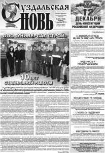 Газета основана 21 марта 1918 г. № 94 (11635) пятница, 11 декабря 2015 г. Общественно политическая газета ООО «УНИВЕРСАЛ СТРОЙ» СТАБИЛЬНОЙ РАБОТЫ 10ЛЕТ ООО «Универсал Строй» было образовано в то время, когда собственники многоквартирных домов были поставлены перед фактом, что по закону теперь все вопросы содержания и ремонта жилья ложатся на них. Для этого можно было выбрать любую форму, к примеру, управляющую компанию. В этот сложный период выйти на рынок жилищно-коммунальных услуг без поддержки государства было большим риском. Перспектива выжить частной обслуживающей организации была лишь у опытных работников, профессионалов. Так получилось у Вавилиных. Организовал фирму Владимир Иванович Вавилин, работающий в жилищно-коммунальной сфере не один десяток лет и знающий городской жилищный фонд как свои пять пальцев. Помогали ему во всем сыновья Альберт и Роман. Так ООО «Универсал Строй» стало семейным делом Вавилиных. После 10 лет успешной работы «Универсал Строй» остается в Суздале единственной частной фирмой в сфере ЖКХ. Многие горожане, особенно те, кто сотрудничает с компанией с момента основания, помнят, как все начиналось. ООО «Универсал Строй» начинало свою деятельность в качестве обслуживающей организации, а через два года это уже была управляющая компания. Со временем поменялось законодательство, и все многоквартирные дома , которые находились под управлением УК, перешли на непосредственное управление жильцами, а управляющая компания «Универсал Строй» стала обслуживающей организацией. Что всегда привлекало и привлекает жителей Суздаля в «Универсал Строе»? Жильцы многоквартирных домов могут согласовать с организацией тариф на содержание и ремонт общедомового имущества. Кроме перечня работ и услуг, связанных с управлением и содержанием общего имущества домов, определенного постановлением Правительства РФ, «Универсал Строй» предоставляет ряд других услуг. Все работы, связанные с установкой и ремонтом сантехнического и инженерного оборудования внутри квартир, выполняются бесплатно. Два раза в год работники фирмы проводят обязательный плановый осмотр инженерных коммуникаций в домах и квартирах. Каждый собственник может получить в компании любые документы, информацию о перечнях, объемах, качестве и периодичности оказанных услуг и выполненных работах. Управляющая компания имеет свой сайт. Лицензирование предпринимательской деятельности по управлению многоквартирными домами, которое проходили в этом году все управляющие компании, позволило отфильтровать слабые УК. Важно отметить, что ООО «Универсал Строй» процедуру лицензирования прошло в числе первых во Владимирской области. Подтверждением стабильности и ответственности компании является тот факт, что 45 домов на протяжении 10 лет выбирают «Универсал Строй» в качестве обслуживающей организации. Конечно, были случаи, когда жители отказывались от их услуг, это их право, но абсолютное большинство за «Универсал Строй». Коллектив управляющей компании сплоченный, здесь практически нет текучки. Работников многие жители знают в лицо и по имени. С самого основания организации работают газосварщик Вадим Бударгин, слесарь Валерий Доронин, слесарь-сантехник Сергей Сорокоумов и нынешний директор Роман Вавилин. В 2009 году он окончил Российскую Академию государственно