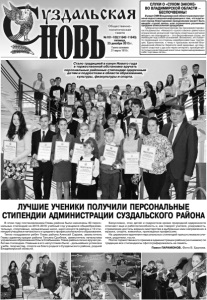 Газета основана 21 марта 1918 г. №101-102(11642-11643) пятница, 25 декабря 2015 г. Общественно политическая газета В этом году постановлением Главы района были назначены 40 персональных стипендий на 2015-2016 учебный год учащимся общеобразовательных, спортивных, музыкальных школ, школ искусств района и 10 стипендий учащимся начального и среднего профессионального образования. Тепло поздравили ребят Глава района Алексей Сараев, заместитель Главы администрации района Татьяна Срибная, заместитель начальника управления образования Ольга Слабышева. Глава района лично вручал ребятам стипендии. Главным в его напутствиях было - дальнейших успехов в учебе, творчестве, спорте на благо родного Суздальского района, родной Владимирской области. Безусловно, этих детей и подростков кроме природной одаренности отличают еще и работоспособность и, как говорят учителя, усидчивость, стремление достичь вершин мастерства в выбранных ими направлених в музыке, спорте, живописи, прикладных профессиях. На церемонии вручения персональных стипендий присутствовали учителя, родители, гости. После торжественного приема в администрации района (на снимках) по традиции все стипендиаты сфотографировались на память. Павел ПАРАМОНОВ. Фото В. Едунова. ЛУЧШИЕ УЧЕНИКИ ПОЛУЧИЛИ ПЕРСОНАЛЬНЫЕ СТИПЕНДИИ АДМИНИСТРАЦИИ СУЗДАЛЬСКОГО РАЙОНА Стало традицией в канун Нового года в торжественной обстановке вручать персональные районные стипендии одаренным детям и подросткам в области образования, культуры, физкультуры и спорта. СЛУХИ О «СУХОМ ЗАКОНЕ» ВО ВЛАДИМИРСКОЙ ОБЛАСТИ – БЕСПОЧВЕННЫ! В ряде СМИ Владимирской области распространена недостоверная информация о том, что в регионе перед Новогодними праздниками может быть введён «сухой закон» или ограничена розничная продажа алкогольной продукции. Губернатор Светлана Орлова так прокомментировала эти домыслы: «Никакого «сухого закона» равно как и ограничения розничной торговли спиртным в регионе вводить не планируется – это беспочвенные слухи, не имеющие под собой оснований. Возможно, это какаято провокация со стороны недобросовестных торговцев. Единственное, к чему я призываю жителей Владимирской области: берегите своё здоровье, не покупайте спиртное с рук или через интернет, приобретайте только качественный алкоголь в зарекомендовавших себя торговых сетях».