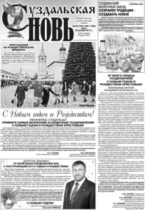 Газета основана 21 марта 1918 г. №103-104(11644-11645) среда, 30 декабря 2015 г. Общественно политическая газета Для каждого из нас – это особенные праздники. Они символизируют преемственность и прочность народных традиций, являются преддверием нового этапа жизни. В Новый год мы хотим взять все лучшее, мы связываем с ним исполнение самых заветных желаний. А Рождество напоминает всем нам о любви и милосердии, свободе и справедливости, утверждает веру в преодоление трудностей, вселяет надежду на лучшее будущее. Уходящий год для жителей Суздальского района, как и для жителей всей России, был годом напряженного труда и ответственных решений. Несмотря на объективные трудности, общими усилиями нам удавалось находить решения проблем, добиваться успехов и достижений. Каждый из нас по мере сил и возможностей вносил частичку своего труда на благо района, стремясь сделать его лучше. И сегодня хотелось бы выразить глубокую признательность всем, кто добросовестно работал, претворяя в жизнь намеченные планы. Каким станет новый год, что он принесет – во многом зависит от каждого из нас. Уверены, что наступающий год станет годом поступательного развития нашего района, сохранения стабильности и согласия. Важно только верить в свои силы и в то, что благополучие нашего района мы создадим вместе! Дорогие земляки! Пусть эти праздничные дни будут согреты заботой близких людей и теплом домашнего очага! Желаем вам счастья, здоровья, благополучия и исполнения самых заветных желаний! ОТ ВСЕГО СЕРДЦА ПОЗДРАВЛЯЕМ С НОВЫМ ГОДОМ И РОЖДЕСТВОМ ХРИСТОВЫМ! УВАЖАЕМЫЕ ЖИТЕЛИ ВЛАДИМИРСКОЙ ОБЛАСТИ! 2015 год - год 70-летия Великой Победы - был богат на важные события. Владимирской области есть чем гордиться в уходящем году. Общими усилиями нам удалось обеспечить рост основных показателей, характеризующих социально-экономическое развитие региона. Объем валового регионального продукта в 2015 году составит 376 млрд. рублей, в 2014 году эта цифра равнялась 340 млрд. Положительная динамика происходит за счет ввода новых объектов в деревообрабатывающем и химическом производствах, в производстве изделий из пластмасс, в стекольной промышленности. В строительстве жилья по итогам года в 33-м регионе ожидается результат в 640 тыс. квадратных метров, в 2014 году было сдано в эксплуатацию 605 тыс. квадратных метров. Ожидаемый объем инвестиций в основной капитал в уходящем году составит порядка 78 млрд. рублей, в 2014-м году этот показатель равнялся 75,7 млрд. В уходящем году Владимирская область успешно презентовала свой инвестиционный потенциал на крупнейших площадках России и зарубежья. Это позволило нашим предприятиям заключить десятки договоров, программ сотрудничества с потребителями нашей передовой продукции, создать новые рабочие места. Благодаря этому мы открывали новые школы и детские сады, строили дороги, спортивные сооружения и объекты здравоохранения, сохранили социальную защиту для ветеранов, детей, молодежи, малоимущих и многодетных семей. Уже второй год подряд в области сохраняется положительная тенденция роста рождаемости. На Владимирской земле прошло много масштабных мероприятий всероссийского уровня, в их числе – молодёжный образовательный форум «Территория смыслов на Клязьме», III экономический форум, «ДоброСаммит». В Год литературы фонд «Русский Мир» выбрал нашу область дл