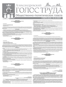 11 МАРТА 2026 г. № 16 (15567) Основана 10 июня 1917 года АДМИНИСТРАЦИЯ АЛЕКСАНДРОВСКОГО МУНИЦИПАЛЬНОГО ОКРУГА ВЛАДИМИРСКОЙ ОБЛАСТИ ПОСТАНОВЛЕНИЕ 20.02.2026 № 317 О подготовке проекта Генерального плана Александровского муниципального округа Владимирской области В соответствии с Градостроительным кодексом Российской Федерации, Федеральным законом Российской Федерации от 20.03.2025 № 33-ФЗ «Об общих принципах организации местного самоуправления в единой системе публичной власти, на основании предложений заинтересованных лиц, руководствуясь Уставом муниципального образования Александровский муниципальный округ, ПОСТАНОВЛЯЮ: 1. Подготовить проект Генерального плана Александровского муниципального округа Владимирской области. 2. Комиссии по землепользованию и застройки администрации Александровского муниципального округа провести работы по организации подготовки проекта Генерального плана Александровского муниципального округа Владимирской области. 3. Заинтересованные лица вправе представить свои предложения по проекту Генерального плана Александровского муниципального округа Владимирской области в Комиссию по землепользованию и застройки по адресу: г. Александров, ул. Красной молодёжи, д.7, в рабочие дни (понедельник-пятница) с 09:00 до 16:00 часов до 10.03.2026 г. 4. Контроль за исполнением настоящего постановления возложить на первого заместителя главы администрации по жилищно- коммунальному хозяйству и развитию инфраструктуры. 5. Настоящее постановление вступает в силу со дня его официального опубликования и подлежит размещению на официальном сайте администрации Александровского муниципального округа в сети Интернет. Глава Александровского муниципального округа А. В. Кузнецова АДМИНИСТРАЦИЯ АЛЕКСАНДРОВСКОГО МУНИЦИПАЛЬНОГО ОКРУГА ВЛАДИМИРСКОЙ ОБЛАСТИ ПОСТАНОВЛЕНИЕ 25.02.2026 № 330 О запрете выхода граждан и выезда техники на лед водных объектов в период весеннего половодья 2026 года на территории Александровского муниципального округа В целях реализации Федерального закона от 20.03.2025 № 33-ФЗ «Об общих принципах организации местного самоуправления в единой системе публичной власти» и постановления правительства Владимирской области от 06.09.2023 № 650 «Об утверждении Правил охраны жизни людей на водных объектах во Владимирской области», обеспечения безопасности и охраны жизни людей, предупреждения происшествий и чрезвычайных ситуаций на водных объектах, связанных с провалом людей и техники под лед на территории Александровского муниципального округа, ПОСТАНОВЛЯЮ: 1. Запретить выход граждан и выезд техники на лед всех водоемов Александровского муниципального округа с 25 февраля 2026 года. 2. Рекомендовать территориальным отделам администрации Александровского муниципального округа: — подготовить и установить в местах вероятного выхода людей и выезда транспортных средств на лед водоемов информационные плакаты, предупреждающие об опасности выхода (выезда) на лед; — провести на подведомственных территориях разъяснительную работу с жителями об опасности выхода (выезда) на лед и передвижения по льду. 3. Рекомендовать начальнику управления образования администрации Александровского муниципального округа Владимирской области в рамках проводимой акции «Осторожно, опасный лед!»: — организовать проведение профилактических бесед с