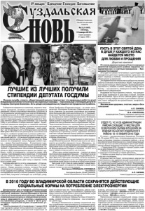 Газета основана 21 марта 1918 г. № 2 (11647) пятница, 15 января 2016 г. Общественно политическая газета Победители предметных олимпиад, лауреаты творческих конкурсов, активные участники молодежных движений и юные спортивные чемпионы собрались в гостеприимном киноконцертном зале во Владимире, на Добросельской, 2г. С 2001 года двести учащихся образовательных учреждений области ежегодно награждаются персональными стипендиями депутата Государственной Думы Григория Аникеева «За отличную учебу и достижения в общественной сфере». Торжественная церемония вручения по традиции проходит дважды в год, в мае и декабре, в рамках долгосрочной программы депутата «Стань успешным – учись новому!». За четырнадцать лет стипендиатами стали более 2600 ребят. Многие из них уже выросли, состоялись как личности, выбрали профессию и успешно работают. - Вот уже второе десятилетие одна из главных целей нашей работы – это вклад в будущее нации, воспитание и развитие детей, раскрытие их талантов. Ведь именно это определяет силу и будущее любой страны, – уверен Григорий Аникеев. – В комплексе с другими нашими программами большое значение имеет традиция вручения стипендий самым одаренным, активным и трудолюбивым школьникам Владимирской области. Ведь принципиально важно для любого ребенка, чтобы те координаты, которые он задал себе в жизни, подтверждали еще и взрослые. И стипендия как раз помогает понять, что его в этом выборе поддерживают, признают его успехи. Это мотивирует на дальнейшие свершения, дает силу и энергию, чтобы идти к своей цели. Награды вручаются в пяти номинациях: «Отличники», «Таланты», «Эрудиты», «Организаторы» и «Спортсмены». Среди умников и умниц, которых Григорий Аникеев лично поздравил на сцене, – восемь учащихся из Суздальского района. Татьяна Булыгина, (Красногвардейская школа) и Юлия Гришина (Суздальская школа №2) получили стипендии за отличную учебу. Юлия Прибылина (Порецкая школа) – за талант организатора. Екатерина Колесова (Гавриловская школа) была отмечена за высокие спортивные достижения. Анна Хализова (Детская школа искусств, п. Садовый), Анастасия Торгова (Садовая школа), Алена Ниманихина (Суздальская православная гимназия) и Екатерина Дыняк (Суздальская школа №2) были награждены за яркие успехи в творчестве. Катя с первого класса занимается в центре внешкольного образования «Исток». Творческая деятельность - насыщенная и многообразная: живопись, танцы, театр моды. Хвалят Катерину и в школе – за высокие результаты в олимпиадах по гуманитарным предметам. По словам педагогов, девушка старательно и прилежно учится, принимает активное участие в общественной жизни учебного заведения и с удовольствием ездит на профильную смену лидеров в лагерь «Искатель». Гордится школа № 2 города Суздаля и шестиклассницей Юлией Гришиной. Юля вот уже много лет занимается в ансамбле народного танца «Меридиан», занимала 2 место на международном конкурсе танцев в Ярославле в 2014 году, вместе с ансамблем побывала на Международном конкурсе в Испании - в 2011-м. А еще с первого класса учится «на отлично». - Юля очень целеустремленная, - говорит ее мама Светлана Александровна Гришина. – Участвует во всех школьных мероприятиях. Это настоящий ребенок-лидер! Депутату Григорию Аникееву хочется выразить большую благодарность за то, что такие дети получают при