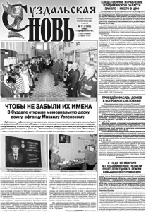 Газета основана 21 марта 1918 г. № 11 (11656) среда, 17 февраля 2016 г. Общественно политическая газета ПРИВЕДЁМ ФАСАДЫ ДОМОВ В ИСПРАВНОЕ СОСТОЯНИЕ! Уважаемые жители города Суздаля! Обращаем ваше внимание на необходимость соблюдения «Правил благоустройства территории муниципального образования г.Суздаль», утверждённых решением Совета народных депутатов МО город Суздаль от 19.11.2013 года N97(ред. от 15.12.2015г. N42), которыми установлено, что: - Собственники зданий, строений и сооружений, иные лица, наделённые соответствующими полномочиями, обязаны содержать фасады указанных объектов (далее - фасады) в исправном состоянии (п. 2.11.8.1); - Фасады зданий, строений, сооружений не должны иметь видимых загрязнений, повреждений, разрушений отдельных элементов, отделочного слоя, водосточных труб, воронок и выпусков, нарушений цветового решения (п. 2.11.8.2); - Собственники индивидуальных жилых домов обязаны содержать их в исправном состоянии, своевременно производить ремонт фасадов принадлежащих им строений и ограждений, осуществлять восстановление разрушающихся домов и надворных построек (п.2.11.10.1). Предлагаем собственникам зданий и индивидуальных жилых домов провести осмотр своих зданий и при наличии выявленных недостатков, перечисленных в разделе 2 части 2.11 «Содержание и ремонт фасадов зданий, строений и сооружений» Правил благоустройства, организовать ремонтные работы по восстановлению фасада (очистка, окраска, восстановление разрушенных или повреждённых архитектурных деталей), тем самым привести его в исправное состояние. Администрация города Суздаля. СЛЕДСТВЕННОЕ УПРАВЛЕНИЕ ВЛАДИМИРСКОЙ ОБЛАСТИ ЗАНЯЛО 1 МЕСТО В ЦФО На расширенном заседании коллегии Следственного управления Следственного комитета России по Владимирской области заместитель Губернатора Сергей Невзоров выступил с докладом о результатах совместной работы органов исполнительной власти со следственными органами, а также о результатах социально-экономического развития региона в 2015 году. В мероприятии приняли участие руководитель Следственного управления Александр Еланцев, заместитель председателя Законодательного Собрания Вячеслав Картухин, главный федеральный инспектор Сергей Мамеев, руководители областных правоохранительных органов, следователи. От лица главы региона Светланы Орловой вице-губернатор поблагодарил сотрудников Следственного управления за напряженную работу по всем направлениям деятельности, в том числе по расследованию преступлений против личности, коррупционных и налоговых преступлений, а также совершенных в отношении несовершеннолетних. «Что очень важно: те задачи, которые были поставлены Президентом России Владимиром Путиным о необходимости максимально оградить граждан от преступности, защитить их права и свободы, успешно решаются. Не менее важно, что решаются они в тесном взаимодействии с органами власти и правоохранительными структурами. Показателем вашей профессиональной работы стало то, что по итогам 2015 года Следственное управление Владимирской области заняло 1 место в Центральном федеральном округе и 8 место среди следственных органов Следственного комитета России», - подчеркнул Сергей Невзоров. «Год был непростым, но мы завершили его с положительной динамикой. При увеличении количества зарегистрированных преступлений в целом по о