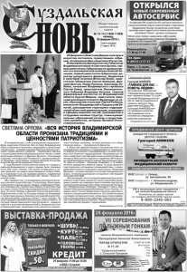 Газета основана 21 марта 1918 г. № 13-14 (11658-11659) пятница, 26 февраля 2016 г. Общественно политическая газета На территории ОАО «Суздальское АТП» при Пункте технического осмотра автомобилей открылся новый автосервис с современным оборудованием. Опытные слесари быстро и качественно произведут ремонт ходовой части и силовых агрегатов легковых автомобилей, ГАЗелей – грузовых и пассажирских. Работает услуга «Экспресс-замена масла» в ДВС и коробке передач, а также диагностика и техническое обслуживание автомобилей (ТО), полировка ЛКП, обработка кузова жидким стеклом. ЛКП, клом. Адрес: г. Суздаль, ул. Транспортная, д. 5 Тел./факс: 8 (49231) 2-51-33 Режим работы: с 9.00 до 19.00 ОТКРЫЛСЯ НОВЫЙ СОВРЕМЕННЫЙ АВТОСЕРВИС Реклама Григорий АНИКЕЕВ: «ГЛАВНОЕ ДЛЯ НАС — ПОМОЧЬ ЛЮДЯМ!» За 4 месяца бесплатные «Передвижные центры здоровья» приняли более 13 тысяч жителей Владимирской области. Автор социального проекта, депутат Государственной Думы РФ Григорий АНИКЕЕВ лично проверил качество обслуживания посетителей на очередном рабочем совещании. (Подробности на 2 стр.) — дороысяч обо Социальный проект ВЫСТАВКАПРОДАЖА ШУБЫ КУРТКИ ПАЛЬТО ГОЛОВНЫЕ УБОРЫ КРЕДИТ* 29 февраля с 9.00 до 18.00 в ЦКД г.Суздаля РЕАЛЬНЫЕ СКИДКИ до 50% ТОЛЬКО В ФЕВРАЛЕ: ИП Уварова Е.Р. ИНН 430700378550, ОГРН 304430708700170. Товар сертифицирован. Реклама. *Кредит предоставляет: ООО Русфинанс банк, лицензия ЦБ РФ №1792 от 13.02.2013 г. Предложение действует с 01.02.2016 г. по 29.02.2016 г. Подробности у продавцов-консультантов. Ы КИ от 15.000 р. Ыот 300 р. ЬТО НЫЕ от 5.500 р. от 3.500 р. «Я поздравляю вас с этим всенародным праздником - Днем защитника Отечества. Вся история Владимирской области буквально пронизана традициями и ценностями патриотизма, - поприветствовала Светлана Орлова участников торжественного собрания. - Неразрывно связаны с нашим краем имена общенациональных героев: князей Александра Невского и Дмитрия Донского, Александра Суворова, князя Дмитрия Пожарского, адмирала Михаила Лазарева, героя Шипки генерала Николая Столетова и многие другие легендарные личности». В годы Великой Отечественной войны из городов и районов Владимирского края в армию было призвано почти 300 тысяч человек, 134 тысячи не вернулось с полей сражений. Не менее самоотверженно ковали Победу и труженики тыла. За трудовую доблесть знаменитый город оружейников Ковров удостоен звания «Город воинской славы». «Мы гордимся тем, что владимирцы принимали активное участие в защите Москвы, Сталинграда, Ленинграда, Севастополя и других наших городов, освобождали Украину и Белоруссию, Прибалтику и Европу. В прошлом году вся наша страна с большим воодушевлением отпраздновала 70-летие Победы в Великой Отечественной войне. Перед вечным огнем на Площади победы во Владимире с портретами родных и близких участников Великой Отечественной войны собралось более 7 тысяч человек. По всем городам и районам прошла акция «Свеча памяти». И сегодня главная задача всех структур области – окружить заботой и участием ветеранов войны, Вооруженных Сил и боевых действий, тружеников тыла, решать их социальные и бытовые проблемы, активно вовлекать их в общественную жизнь», - подчеркнула Губернатор. У областной администрации и органов местного самоуправления налажены и поддерживаются традиционно добрые отношения с командованием и личным составом всех воинских подразделений. Владимирск
