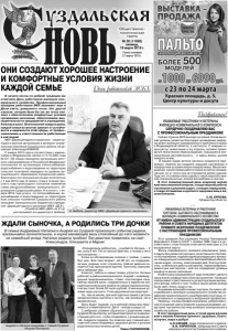 Газета основана 21 марта 1918 г. № 20 (11665) пятница, 18 марта 2016 г. Общественно политическая газета УВАЖАЕМЫЕ РАБОТНИКИ И ВЕТЕРАНЫ ЖИЛИЩНО-КОММУНАЛЬНОГО КОМПЛЕКСА! СЕРДЕЧНО ПОЗДРАВЛЯЮ ВАС С ПРОФЕССИОНАЛЬНЫМ ПРАЗДНИКОМ! Сейчас отрасль ЖКХ выходит на новый, более высокий уровень развития благодаря проведению реформы всего жилищно-коммунального комплекса страны и Владимирской области, в частности. С каждым годом растут инвестиции в эту отрасль, активно проводится техническое переоснащение, повышается экономическая рентабельность – и здесь важны усилия каждого из вас. В вашем труде жители региона нуждаются ежедневно. Именно вы создаете хорошее настроение и комфортные условия жизни каждой семье. Ваша ежедневная, кропотливая работа порой остаётся незамеченной, но от этого она не становится менее нужной. Труд тех, кто связал свою судьбу с такой мирной и важной специальностью, всегда востребован и значим. В этот знаменательный день искренне желаю вам неиссякаемой энергии, плодотворной работы и успешного решения задач, стоящих перед вами, а также оптимизма и крепкого здоровья вам и вашим близким. С.Ю.ОРЛОВА, Губернатор области. * * * УВАЖАЕМЫЕ ВЕТЕРАНЫ И РАБОТНИКИ ТОРГОВЛИ, БЫТОВОГО ОБСЛУЖИВАНИЯ И ЖИЛИЩНО-КОММУНАЛЬНОГО ХОЗЯЙСТВА! ОТ ИМЕНИ АДМИНИСТРАЦИИ СУЗДАЛЬСКОГО РАЙОНА И СОВЕТА НАРОДНЫХ ДЕПУТАТОВ ПРИМИТЕ ИСКРЕННИЕ ПОЗДРАВЛЕНИЯ С НАСТУПАЮЩИМ ПРОФЕССИОНАЛЬНЫМ ПРАЗДНИКОМ! Этот праздник был учрежден Указом Президиума Верховного Совета СССР 1 ноября 1988 года и в соответствии с этим Указом отмечается ежегодно в 3-е воскресенье марта. Жизнь современного человека невозможно представить без развитой торговли, качественного бытового обслуживания, надёжно функционирующего жилищно-коммунального комплекса. Бесперебойное обеспечение водой, теплом, электроэнергией, благоустройство, стабильная работа магазинов, парикмахерских, ремонтных мастерских – всё это определяет уровень комфорта жизни населения. Именно ваш каждодневный труд позволяет сделать нашу жизнь комфортной и благоустроенной. На ваших плечах лежит ответственность за эксплуатацию жилищного фонда, забота о том, чтобы в наших домах всегда были свет, тепло, вода и газ. Выражаем всем работникам торговли, бытового обслуживания и жилищно-коммунального хозяйства искреннюю признательность за добросовестный труд, ответственность и преданность выбранной профессии. Уверены, что ваш профессионализм, добросовестное отношение к делу позволят и дальше развивать индустрию торговли и систему жилищно-коммунального хозяйства района. В этот праздничный день от всей души желаем вам и вашим близким крепкого здоровья, благополучия, мира и добра! А.П.САРАЕВ, Глава Суздальского района. В.В. КИРИЛЛОВ, председатель Совета народных депутатов Суздальского района. ОНИ СОЗДАЮТ ХОРОШЕЕ НАСТРОЕНИЕ И КОМФОРТНЫЕ УСЛОВИЯ ЖИЗНИ КАЖДОЙ СЕМЬЕ В начале весны по доброй традиции мы отмечаем День работников жилищно-коммунального хозяйства. Профессиональный праздник работников ЖКХ называют еще и Днем света, домашнего тепла. Нет другой отрасли, которая была бы так же тесно связана с обеспечением комфортных условий проживания населения, обеспечением жизнедеятельности предприятий и учреждений, больниц и школ. Благополучие каждого дома, каждой семьи во многом зависит от устойчивости и надежности этой сфер