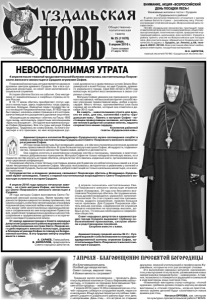 Газета основана 21 марта 1918 г. № 25 (11670) среда, 6 апреля 2016 г. Общественно политическая газета Покровский монастырь сегодня является одним из духовных центров древнего Суздаля. Как и все суздальские монастыри, он несет свое молитвенное и социальное служение. История обители богата на события. Она неотделима от знаменательных и скорбных страниц истории России. В 16-17 веках обитель приобретает статус царского монастыря, здесь подвизались тогда царицы, княгини, боярыни. Именитые люди государства часто посещали Покровский монастырь. В 1923 году он был закрыт, началась новая страница в его истории, запечатлевшая его разорение и духовное опустение. «Воскресшая из мертвых» обитель на Пасху 1992 года вновь наполнилась радостным восклицанием «Христос Воскресе!». 24 года ее возглавляла матушка София (Комарова). Все эти годы матушка София трудилась. Трудилась во славу Божию, на благо монастыря и его прихожан, во имя возрождения русской духовности и нравственных устоев Земли Владимирской и всей России, во имя Суздаля, древнего уникального города. Свое 650-летие в 2014 году монастырь встретил восстановленным в своих старинных стенах. Матушку Софию уважали как признанного духовного наставника, чей высокий авторитет способствовал упрочению православной веры, добра и милосердия. Много теплых, проникновенных слов было сказано ей на юбилее, который она отметила в декабре 2015 года. Ее смерть - невосполнимая утрата для всех, кто ее знал, для нас, коллектива газеты «Суздальская новь». Память о матушке Софии - настоящем православном человеке, который своим теплом и добротой согревал многих, надолго сохранится в наших сердцах. Коллектив районной газеты «Суздальская новь». НЕВОСПОЛНИМАЯ УТРАТА 4 апреля после тяжелой продолжительной болезни скончалась настоятельница Покровского женского монастыря в Суздале игумения София. Администрация и коллектив Владимиро-Суздальского музея-заповедника скорбят в связи со смертью настоятельницы Суздальского Свято-Покровского женского монастыря игумении Софии. 24 года назад монастырь был возвращён церкви, и в нём восстановлена иноческая духовная жизнь православной обители. В этом большая заслуга матушки Софии, её мудрости, подвижничества, преданности ценностям Православия, доброте и деловитости. Она сумела сплотить в молитвенном служении сестёр и послушниц, прихожан и многочисленных добровольных помощников. Матушка София не только наладила иноческую жизнь, но и подвигла сестёр изучать историю обители, результатом чего явились изданные книги, организованные научно-церковные конференции. Покровская обитель стала тёплым счастливым домом для 8 девочек из неблагополучных семей и в этом также неоценимый вклад игумении Софии. Матушка пользовалась авторитетом и уважением у жителей и руководителей Суздаля, была наставницей и доброй советчицей не только насельниц монастыря, но и многих прихожан. Сотрудничество и взаимное уважение связывают Покровскую обитель и Владимиро-Суздальский музей-заповедник. Память о первой настоятельнице возрождённого Свято-Покровского монастыря останется в истории Суздаля. ВНИМАНИЕ, АКЦИЯ «ВСЕРОССИЙСКИЙ ДЕНЬ ПОСАДКИ ЛЕСА»! Уважаемые жители и гости г. Суздаля и Суздальского района! В целях воспитания бережного отношения к одному из главных богатств страны – российскому лесу, Рослесхоз