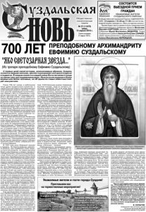 Газета основана 21 марта 1918 г. № 27 (11672) среда, 13 апреля 2016 г. Общественно политическая газета Ровно 700 лет назад, в небольшом тогда уделе Суздальского княжества, в семье благочестивых и богобоязненных нижегородцев родился мальчик, с раннего детства проявивший исключительную любовь к Богу и стремление к подвигам благочестия. Не оказывая интереса к детским играм, отрок любил посещать Божий храм и там погружаться в молитву. В заботах о воспитании сына, родители отдали его в книжное учение. В совсем юном возрасте он оставил родительский дом и ушёл в Вознесенский Печёрский монастырь, что около Нижнего Новгорода. Приняв иноческое пострижение, юный Евфимий начал ревностно трудиться под духовным руководством святого Дионисия, храня глубокое послушание и не щадя своих сил. В то время Вознесенскую Печёрскую обитель часто посещал суздальский князь Борис Константинович, почитавший старца Дионисия, и ни одного важного дела не предпринимавший без его благословения. Славившийся своей богобоязненностью, князь решил построить в Суздале храм в честь Преображения Господня, а при нём составить общежитейное братство, ибо крайне почитал иноческое делание. В поисках человека способного возглавить строительство и собрать общину князь Борис и обратился к Дионисию. Преподобный благословил богоугодное намерение князя и обещал прислать своего инока, избрав для этого инока Евфимия. В 1352 году инок Евфимий пришёл в Суздаль. По благословению святителя Иоанна, при поддержке князя Бориса Константиновича, на левом высоком берегу реки Каменки, к северо-западу от города начинает строиться новый монастырь. Всего за 5 лет строительство было закончено. Преображенский собор своей красотой и благолепием вызывал изумление у всех, кто видел его. Князь Борис украсил новый храм богатыми иконами, снабдил богослужебными книгами и утварью. По благословению архипастыря, инок Евфимий устроил для себя место вечного упокоения, собственными руками отесав три камня и соорудив из них гробницу у северной стены собора. За годы строительства Евфимий был посвящён в сан иеродьякона, затем в иеромонаха, а по завершении строительства монастырской ограды и братских келий он был возведен в сан архимандрита. В знак особой чести архимандриту Евфимию было дано право совершать богослужения с палицей, в митре и с рипидами. Это преимущество сохранялось за настоятелями Спасской обители и после кончины своего первоначальника. Под руководством настоятеля, славного своими подвигами, собралось множество иноков. Скоро численность братии монастыря превысила триста человек. Появилась нужда в расширении обители. Под руководством архимандрита Евфимия сначала возводится храм в честь преподобного Иоанна Лествичника, с каменной трапезной и пекарней, а затем и храм в честь святителя Николая Чудотворца с больницей и погребом. По указанию Евфимия была устроена па- (Из тропаря преподобному Евфимию Суздальскому) "ЯКО СВЕТОЗАРНАЯ ЗВЕЗДА..." году, Евфимий пережил нашествие Тамерлана и стал свидетелем чуда – икона Божией Матери Владимирской спасла Москву от осады великого хана. 1 апреля 1404 года, приобщившись Святых Тайн, он предал свою душу Богу. Тотчас келья преподобного наполнилась благоуханием. Согласно завещания, святой подвижник был похоронен в месте, которое он устроил для себя при строите