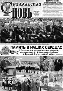 Газета основана 21 марта 1918 г. № 30 (11675) пятница, 22 апреля 2016 г. Общественно политическая газета ПАМЯТЬ В НАШИХ СЕРДЦАХ В Суздальском районе прошел марафон, посвященный 71-й годовщине Победы в Великой Отечественной войне В ОБЛАСТИ НАЧАЛСЯ ПОЖАРООПАСНЫЙ СЕЗОН С 18 апреля по 17 октября 2016 года на территории Владимирской области установлен пожароопасный сезон. Соответствующее постановление подписано Губернатором региона. В этот период запрещено проведение неконтролируемых палов травы, разжигание костров в лесах, а также сжигание мусора на приусадебных участках. Таким образом, запрещено любое разведение открытого огня на природе. За нарушение этого требования предусмотрено административное наказание в виде штрафа в размере до 3-х тысяч рублей. Как сообщил заместитель начальника Главного управления МЧС по Владимирской области – начальник управления надзорной деятельности и профилактической работы Александр Нужных, в регионе к административной ответственности за сжигание сухой травы и разведение костров уже привлечены 67 человек. Читайте на 2 стр. Ветераны Великой Отечественной войны Виталий Ефимович Костин, Василий Дмитриевич Панин, Михаил Михайлович Юрин, Николай Григорьевич Лоншаков и Валерий Леонидович Еремин, председатель Боголюбовского отделения ВРОО «Дети войны». Фото В. Едунова.