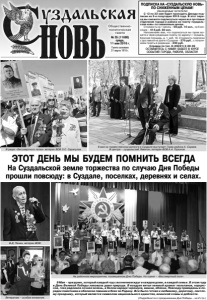 Газета основана 21 марта 1918 г. № 35 (11680) среда, 11 мая 2016 г. Общественно политическая газета ЭТОТ ДЕНЬ МЫ БУДЕМ ПОМНИТЬ ВСЕГДА На Суздальской земле торжества по случаю Дня Победы прошли повсюду: в Суздале, поселках, деревнях и селах. 9 Мая – праздник, который каждый год с волнением ждут в каждом доме, в каждой семье. В этом году в День Великой Победы ликовала даже природа. В воздухе витал нежный аромат тюльпанов, нарциссов, глаз радовала сочная зелень, в белом наряде черемуха, вишни, яблони. Повсюду приведены в порядок памятники и обелиски павшим в боях за Родину. Все было готово к любимому, дорогому, светлому празднику, который является символом национального единства, воинской славы и доблести. (Подробности о праздновании Дня Победы – на 2 стр.) ПОДПИСКА НА «СУЗДАЛЬСКУЮ НОВЬ» ПО СНИЖЕННЫМ ЦЕНАМ! УВАЖАЕМЫЕ ЧИТАТЕЛИ! С 12 по 22 мая будет проходить Декада подписки на 2-е полугодие 2016 года. В этот период вы сможете подписаться через все почтовые отделения города и района на газету «Суздальская новь» по сниженным ценам. Стоимость на 1 месяц – 69 руб. 10 коп., на 6 месяцев – 414 руб. 60 коп. Напоминаем вам, что подписаться вы также можете и через редакцию газеты по адресу: г. Суздаль, Красная площадь, д. 1, каб. 18. Стоимость подписки с доставкой на дом в г.Суздале – 270 руб., с получением газеты в редакции – 240 руб. Справки по тел. 8 (49231) 2-08-95 ОСТАВАЙТЕСЬ С НАМИ! БУДЬТЕ В КУРСЕ СОБЫТИЙ ГОРОДА, РАЙОНА, ОБЛАСТИ! Реклама 9 мая на торжественном митинге в Суздале выступает Глава района А. Сараев. В центре – суздальский Левитан, ветеран ВОВ А.А. Горшков. На районном мероприятии, посвященном Дню Победы. На сцене – «Бессмертный полк». Ветеранам – особое внимание. В.Д. Панин, ветеран ВОВ. В рядах «Бессмертного полка» ветеран ВОВ З.С. Сарапулов.