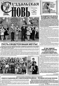 Газета основана 21 марта 1918 г. № 39 (11684) среда, 25 мая 2016 г. Общественно политическая газета ВО ВЛАДИМИРСКОЙ ОБЛАСТИ ПРОХОДЯТ ДНИ СЛАВЯНСКОЙ ПИСЬМЕННОСТИ И КУЛЬТУРЫ 23 мая в пресс-центре администрации Владимирской области состоялась пресс-конференция, посвященная проведению во Владимирской области Дня славянской письменности и культуры. Её провели директор Гуманитарного института ВлГУ имени А.Г. и Н.Г.Столетовых Елена Петровичева, иеромонах Варфоломей (о. Сергей Минин), представитель кафедры гуманитарного образования Владимирского института развития образования (ВИРО) имении Л.И. Новиковой Светлана Блинова. Они рассказали о мероприятиях, которые проходят в области в память Святых равноапостольных Кирилла и Мефодия - первоучителей словенских. Иеромонах Варфоломей напомнил, что праздник славянской письменности и культуры был возрожден еще в советские времена – в 1985 году. Ранее в качестве центра празднований выбирались разные города, но затем это право закрепилось за Москвой, в том числе и потому, что в этот день отмечает день своего тезоименитства патриарх Кирилл. В нашем регионе с 2009 года базовой площадкой празднований стал Владимирский государственный университет. В этом году в течение двух дней здесь выступал с циклом открытых лекций доктор философии, профессор Университета Эрланген-Нюрнберг (Германия) Карл Христиан Фельми. А 19 мая стартовала VIII Международная научная конференция по теме «Церковь, государство и общество в истории России и православных стран: религия, наука и образование». Её открыл митрополит Митрополит Владимирский и Суздальский Евлогий. 23-24 мая празднования продолжились в университетском храме Святых равноапостольных Кирилла и Мефодия. Подытоживая, иеромонах Варфоломей подчеркнул, что наследие Святых равноапостольных Кирилла и Мефодия, безусловно, отвечает на те внешние вызовы, которые претерпевает сегодня самоидентичноть славянского мира. Торжественно отзвенели в школах города и района последние звонки. Выпускники двух городских и пятнадцати сельских школ принимали напутствия и поздравления, дарили цветы и песни родным школам, любимым учителям. 478 ребят заканчивают девятый и одиннадцатый классы в нашем районе, 158 учеников - в школах города. 23 мая Глава Суздальского района А. Сараев тепло поздравил выпускников средних школ №1 и №2 города Суздаля, а руководители структурных подразделений администрации района побывали в сельских школах на последних звонках. Они пожелали ребятам веры в себя, доброго пути и успешного прохождения итоговой аттестации, которая для девятиклассников начнётся уже 26 мая. Этот праздник всегда очень радостный и немного печальный. Звонко и чуть грустно прозвенел последний звонок для выросших детей, уходящих в большую жизнь. Улетели в солнечное небо воздушные шары с заветными желаниями. Впереди - экзамены, колледжи и вузы, новые открытия и задачи со многими неизвестными, новые свершения. Впереди - большая взрослая жизнь. Теперь фото в альбомах и соц. сетях будут напоминанием о школьной поре, а полученные в школе знания, умения станут тем прочным основанием, на котором будет строиться ваш успех, дорогие выпускники! Елена ФОКИНА. Фото автора. ПУСТЬ СБУДУТСЯ ВАШИ МЕЧТЫ! Последний школьный звонок – это первая ступень в большую жизнь. Впереди – серьезные испытания, принятие о