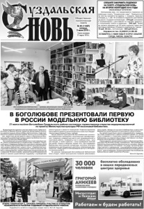 Газета основана 21 марта 1918 г. № 42 (11687) пятница, 3 июня 2016 г. Общественно политическая газета В мероприятии приняли участие заместитель Губернатора области Михаил Колков, директор департамента культуры администрации области Вера Зиннатуллина, Глава Суздальского района Алексей Сараев. Были и гости из Москвы – зам. директора департамента науки и образования Минкультуры России Евгения Гусева и директор Библиотеки иностранной литературы Вадим Дуда. Боголюбовская сельская библиотека стала первой в стране, реконструированной по модельному стандарту. Пилотный проект поддержки библиотек стартовал в середине 2015 года. В рамках программы Министерство культуры разработало модель библиотеки «нового типа», а Библиотека иностранной литературы создала дизайн, помогла закупить мебель и оборудование, предоставила дистанционный доступ к изданиям. В свою очередь, администрация Владимирской области оказала существенную поддержку с проведением реконструкции и ремонта помещений. Софинансирование масштабного ремонта из регионального и местного бюджетов составило более 2,5 млн. рублей. После ремонта пространство Боголюбовской поселковой библиотеки претерпело значительные преобразования: появились комфортные места для индивидуальной и групповой работы, конференц-зал и учебный класс, зона для лекций, а также отдельно - зоны проведения занятий для детей, отдыха и общения. Кроме того, при поддержке Библиотеки иностранной литературы читатели получили возможность дистанционного доступа к электронным версиям книг. Также имеется беспроводной доступ в Интернет по технологии Wi-Fi. По мнению заведующей Боголюбовской библиотекой Ольги Андон, новое пространство позволит реализовать массу идей: «Теперь это не просто библиотека, а центр проведения интеллектуального и культурного досуга селян». На презентации было много поздравлений и подарков. Так Глава Суздальского района Алексей Сараев не только тепло поздравил с открытием первой в стране модельной библиотеки, но и вручил Ольге Андон сертификат на оборудование велопарковки у библиотеки. Представитель департамента науки и образования Минкультуры РФ Евгения Гусева подчеркнула: «Боголюбовская библиотека была выбрана Минкультом не случайно. Можно сделать новые стены, но главное - это люди. Тут многие факторы совпали: и заведующая - лучший библиотекарь страны, и область по основным показателям библиотечной деятельности - одна из ведущих. На данный момент Боголюбовская библиотека не имеет аналогов в России». Фото В. Едунова. ВЧЕРА ГУБЕРНАТОР С. ОРЛОВА ПРИНЯЛА УЧАСТИЕ В ОТКРЫТИИ ПАНСИОНАТА В ПОСЁЛКЕ САДОВЫЙ СУЗДАЛЬСКОГО РАЙОНА Подробности читайте в следующем номере газеты. Фото В. Едунова. В БОГОЛЮБОВЕ ПРЕЗЕНТОВАЛИ ПЕРВУЮ В РОССИИ МОДЕЛЬНУЮ БИБЛИОТЕКУ 31 мая в посёлке Боголюбово Суздальского района состоялось торжественное открытие модернизированной по проекту Министерства культуры РФ поселковой библиотеки. СПЕШИТЕ ОФОРМИТЬ ПОДПИСКУ НА ГАЗЕТУ «СУЗДАЛЬСКАЯ НОВЬ» НА ВТОРОЕ ПОЛУГОДИЕ 2016 ГОДА! УВАЖАЕМЫЕ ЧИТАТЕЛИ! Напоминаем вам, что продолжается подписка на районную газету “Суздальская новь”. Подписаться на нее вы сможете по адресу: г. Суздаль, Красная площадь, д. 1, каб. 18. Стоимость подписки с доставкой на дом в г. Суздале на 6 месяцев – 270 руб. (не менее 5 экземпляров с доставкой по одному 