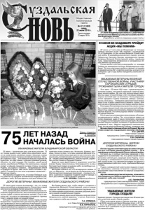 Газета основана 21 марта 1918 г. № 47 (11692) среда, 22 июня 2016 г. Общественно политическая газета 22 июня наша страна вспоминает тех, кто отдал жизнь за свободу и независимость Отечества в самой жестокой и кровавой битве прошлого столетия. Этот июньский день изменил жизнь нескольких поколений. Кровопролитная, жестокая война искалечила тысячи судеб и унесла миллионы жизней. Спустя десятки лет, эта дата по-прежнему отзывается горечью утрат в каждом доме и в каждой семье. Сегодня мы низко склоняем головы перед нашими ветеранами, подарившими нам мирное небо над головой, возможность жить и работать в свободной стране. Судьба подарила нам возможность жить рядом с вами, поколением военного времени, учиться у вас терпению и мужеству, душевной щедрости и любви к родной земле. Мы будем делать все, чтобы память о солдатах и тружениках Великой Отечественной, жила в наших сердцах, передавалась из поколения в поколение, чтобы связь времен укреплялась нашими добрыми делами и нашим созидательным трудом. Желаем нашим дорогим ветеранам, всем жителям Суздальского района здоровья, счастья, благополучия и мирного неба над головой! Т.А. СРИБНАЯ, и.о. Главы Суздальского района В.В. КИРИЛЛОВ, председатель Совета народных депутатов Суздальского района. УВАЖАЕМЫЕ ЖИТЕЛИ ВЛАДИМИРСКОЙ ОБЛАСТИ! ДОРОГИЕ ВЕТЕРАНЫ! УВАЖАЕМЫЕ ЖИТЕЛИ СУЗДАЛЬСКОГО РАЙОНА! 22 июня - трагическая дата для всех россиян. 75 лет назад фашистские захватчики вероломно напали на нашу землю, развязав самую страшную, самую кровопролитную в истории человечества войну. Четыре страшных года… Эта война не обошла стороной ни один дом, ни одну семью, собирая кровавый урожай, обильно, не зная пощады. Мы помним, какой ценой далась нам Великая Победа. Не жалея жизни, каждый солдат и офицер сражался за свою страну, за малую Родину, за родных и близких… Владимирская земля отправила на фронт 280 тысяч своих сыновей и дочерей. Половина из них пала в кровавых сражениях… Вечная им память. Мы помним и подвиги тех, кто ковал Победу в тылу. Кто работал на пределе человеческих возможностей, забывая о себе. Всё для фронта, всё для Победы! Неприятель хотел сломить нас. Не вышло. Кровью, пытками, болью потерь, тяготами лишений Великая Отечественная война лишь еще крепче нас сплотила, раскрыла весь человеческий и духовный потенциал народа – людей самоотверженных, сильных духом, радеющих за настоящее и будущее Родины. Дорогие наши фронтовики и труженики тыла! Мы всегда будем преисполнены благодарности за ваш бессмертный подвиг, за мирное небо, за свободу и независимость нашей Отчизны. Мы будем помнить тех, кто не вернулся с войны. И тех, кто вернулся – но не дожил до сегодняшнего дня. Святая миссия следующих поколений – сохранить память о ратном и трудовом Подвиге нашего народа и быть достойными своих великих предков. С.Ю. ОРЛОВА, Губернатор области. ЛЕТ НАЗАД НАЧАЛАСЬ ВОЙНА 75 В этом году мы отмечаем одну из самых печальных дат в истории нашей великой страны – 75-ю годовщину начала Великой Отечественной войны. Сегодня мы с особым чувством уважения и благодарности вспоминаем тех, кто ценой своей жизни выполнил святой долг, защищая свою Родину, отстоял свободу и независимость нашего Отечества. Низкий поклон всем, кто героически воевал на фронте и самоотверженно работал в тылу, приближая Великую Победу. Подвиг, совершенный сове