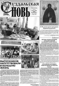 Газета основана 21 марта 1918 г. № 49 (11694) среда, 29 июня 2016 г. Общественно политическая газета С 17 июня в музейном комплексе «Спасо-Евфимиев монастырь» открыта новая выставка, посвященная 700-летию основателя данной обители. Речь идет о преподобном Евфимии Суздальском (1316?–1404) - постриженике святого Дионисия и «духовного собеседника» Сергия Радонежского. Подробности читайте в приложении «Музейный град» на 3 стр. К 700 летию святого преподобного Евфимия Суздальского Поздравляем! 23 июня во Владимире в ходе пленарного заседания VI парламентского форума «Историко-культурное наследие» председатель регионального парламента Тироля (Австрия), председатель Конгресса местных и региональных властей Совета Европы в 2012-2014 годах Хервиг ван Стаа вручил Губернатору Владимирской области Светлане Орловой высшую награду земли Тироль - «Большой орден Тирольского Орла в золоте». «Передаю фрау Орловой большой привет от жителей федеральной земли Тироль в Австрии. Она много сделала не только для развития своей области, но и для укрепления международных отношений между Австрией и Россией, неоднократно посещала наш регион в составе российской делегации», - сообщил господин ван Стаа. Почётный гость мероприятия поблагодарил всех организаторов за приглашение на парламентский форум и пожелал плодотворной работы, добавив, что «русская культура требует глубокого уважения: она имеет чрезвычайно важное значение для мировой истории». «Я вижу, как вы любите свою страну, свою историю и культуру, какую дань уважения вы отдаёте своим героям. Это может послужить хорошим примером нам, европейцам», - подчеркнул Хервиг ван Стаа. Совсем недавно исполнилось 50 лет со времени образования Всероссийского Общества охраны памятников истории и культуры (ВООПИиК). На днях в Москве прошёл торжественный пленум Центрального совета ВООПИиК, посвящённый этому событию с участием представителей Государственной Думы, Министерства культуры и других заинтересованных служб и ведомств, а также многих региональных отделений Общества. От президиума Суздальского отделения ВООПИиК в пленуме приняли участие Алла Зайкова, его председатель, директор Суздальского филиала ВладимироСуздальского музея-заповедника и Светлана Колбина, зав. отделом по связям с общественностью и СМИ администрации г. Суздаля. На пленуме все выступающие подчеркивали большие заслуги Общества и общественности в сохранении и популяризации культурно-исторического наследия нашей страны. В связи с юбилеем состоялось награждение активистов движения. Грамотой Министра культуры России была награждена и Алла Зайкова за большой вклад в сохранение историко-культурного наследия России. АЛЛА ЗАЙКОВА НАГРАЖДЕНА ГРАМОТОЙ МИНИСТРА КУЛЬТУРЫ РОССИИ СВЕТЛАНУ ОРЛОВУ НАГРАДИЛИ «БОЛЬШИМ ОРДЕНОМ ТИРОЛЬСКОГО ОРЛА В ЗОЛОТЕ» ВЫПУСКНИКОВ НАПУТСТВОВАЛИ В БОЛЬШУЮ ЖИЗНЬ 24 июня чествовали выпускников 11-х классов городских и сельских школ. Начались мероприятия в конференц-зале администрации района. Сюда на вручение медалей «За особые успехи в учебе» собрались учителя, директора школ, родители выпускников, которые по итогам учебы стали лучшими. Их в этом году 14 человек. Со словами приветствия обратились к ребятам заместитель Главы района Татьяна Срибная, заместитель председателя Законодательного Собрания области Вячеслав Кар
