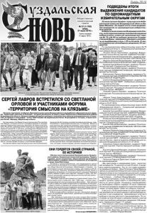 Газета основана 21 марта 1918 г. № 57 (11702) среда, 27 июля 2016 г. Общественно политическая газета ПОДВЕДЕНЫ ИТОГИ ВЫДВИЖЕНИЯ КАНДИДАТОВ ПО ОДНОМАНДАТНЫМ ИЗБИРАТЕЛЬНЫМ ОКРУГАМ 25 июля прошел брифинг председателя Избирательной комиссии Владимирской области Вадима Минаева. Он подвел итоги этапа выдвижения кандидатов по одномандатным избирательным округам. Избирательная комиссия Владимирской области, на которую возложены полномочия окружных избирательных комиссий одномандатных округов № 79 и № 80 на выборах депутатов Государственной Думы, завершила принимать документы на выдвижение в ночь с 23 на 24 июля. О своем выдвижении облизбирком уведомили 20 кандидатов. По одномандатному избирательному округу № 79 «Владимирская область - Владимирский одномандатный избирательный округ»: - Игошин Игорь Николаевич, выдвинут Всероссийской политической партией «ЕДИНАЯ РОССИЯ»; - Майоров Алексей Владимирович, выдвинут Всероссийской политической партией «ПАРТИЯ РОСТА»; - Авдохин Алексей Владимирович, выдвинут ВСЕРОССИЙСКОЙ ПОЛИТИЧЕСКОЙ ПАРТИЕЙ «РОДИНА»; - Казаков Сергей Валентинович, выдвинут Политической партией «Гражданская Платформа»; - Петухов Сергей Викторович, выдвинут Политической партией КОММУНИСТИЧЕСКАЯ ПАРТИЯ КОММУНИСТЫ РОССИИ; - Емельянова Лариса Николаевна, выдвинута Политической партией «КОММУНИСТИЧЕСКАЯ ПАРТИЯ РОССИЙСКОЙ ФЕДЕРАЦИИ»; - Сипягин Владимир Владимирович, выдвинут Политической партией ЛДПР - Либерально-демократическая партия России; - Ефремов Алексей Николаевич, выдвинут Политической партией «Российская объединенная демократическая партия «ЯБЛОКО»; - Ковалев Кирилл Юрьевич, выдвинут Политической партией «Российская экологическая партия «Зеленые»; - Марков Тимур Александрович, выдвинут Политической партией СПРАВЕДЛИВАЯ РОССИЯ, зарегистрирован Избирательной комиссией Владимирской области 23.07.2016. По одномандатному избирательному округу № 80 «Владимирская область – Суздальский одномандатный избирательный округ»: - Аникеев Григорий Викторович, выдвинут Всероссийской политической партией «ЕДИНАЯ РОССИЯ»; - Усачев Алексей Викторович, выдвинут ВСЕРОССИЙСКОЙ ПОЛИТИЧЕСКОЙ ПАРТИЕЙ «РОДИНА; - Колесник Анна Владимировна, выдвинута Общественной организацией Всероссийская политическая партия «Гражданская Сила»; - Клопов Сергей Михайлович, выдвинут Политической партией КОММУНИСТИЧЕСКАЯ ПАРТИЯ КОММУНИСТЫ РОССИИ; - Бундина Людмила Александровна, выдвинута Политической партией «КОММУНИСТИЧЕСКАЯ ПАРТИЯ РОССИЙСКОЙ ФЕДЕРАЦИИ»; - Потапов Илья Александрович, выдвинут Политической партией ЛДПР - Либерально-демократическая партия России, зарегистрирован Избирательной комиссией Владимирской области 21.07.2016; - Николенко Кирилл Дмитриевич, выдвинут Политической партией «Партия народной свободы» (ПАРНАС); - Кушпита Дмитрий Юрьевич, выдвинут Политической партией «Российская объединенная демократическая партия «ЯБЛОКО»; - Беляков Валерий Иванович, выдвинут Политической партией СПРАВЕДЛИВАЯ РОССИЯ; - Петросян Рафаэль Давитович, выдвинут в порядке самовыдвижения. «Мы приступили к следующему этапу - регистрация кандидатов. По данным на утро 25 июля, 2 кандидата зарегистрированы. Это те, кто подал документы одними из первых – Илья Потапов и Тимур Марков. Завтра на заседании Избирательной комиссии Владимирской области мы