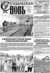 Газета основана 21 марта 1918 г. № 59 (11704) среда, 3 августа 2016 г. Общественно политическая газета 5 августа в ЦКД г.Суздаля (Красная площадь, д.5) Реклама ВЫБОРЫ В ГОСУДАРСТВЕННУЮ ДУМУ РОССИЙСКОЙ ФЕДЕРАЦИИ УВАЖАЕМЫЕ ИЗБИРАТЕЛИ! Приглашаем вас 18 сентября 2016 года с 8.00 до 20.00 принять участие в голосовании на выборах депутатов Государственной Думы Федерального Собрания Российской Федерации седьмого созыва. Избиратель, который в день голосования не сможет прибыть в помещение для голосования того избирательного участка, где он включен в список избирателей, вправе в установленные законом сроки получить открепительное удостоверение и принять участие в голосовании на том избирательном участке, на котором он будет находиться в день голосования. Открепительное удостоверение выдается на основании письменного заявления избирателя, участника референдума с указанием причины, по которой ему требуется открепительное удостоверение. Для написания заявления при себе необходимо иметь паспорт гражданина Российской Федерации. Выдача открепительных удостоверений избирателям будет производиться: с 3 августа по 6 сентября 2016 года в Территориальной избирательной комиссии Суздальского района по адресу: г. Суздаль, ул. Красная площадь, д. 1, каб. 67. График работы: в рабочие дни с 8.00 до 12.00 и с 13.00 до 19.00, в выходные и праздничные дни с 9.00 до 13.00. С 7 по 17 сентября 2016 года выдача открепительных удостоверений будет производиться в участковых избирательных комиссиях. В ПРЕДДВЕРИИ ЕДИНОГО ДНЯ ГОЛОСОВАНИЯ ОТКРЫТА «ГОРЯЧАЯ ЛИНИЯ» ПРИ УПОЛНОМОЧЕННОМ ПО ПРАВАМ ЧЕЛОВЕКА ВО ВЛАДИМИРСКОЙ ОБЛАСТИ В преддверии единого дня голосования 18 сентября 2016 года открыта «горячая линия» при Уполномоченном по правам человека во Владимирской области. С 1 августа любой избиратель может обратиться, в случае нарушения его прав, в рамках избирательного процесса. По словам Уполномоченного по правам человека Людмилы Романовой, «горячая линия» – это один из инструментов, обеспечивающих прозрачность выборов, и любое обращение гражданина будет рассмотрено незамедлительно. «Горячая линия» будет работать с 1 августа по 30 сентября 2016 года. Позвонить на нее можно по телефону 8 900 478 00 33 в будние и выходные дни с 8.00 до 22.00 (звонок платный, оплата согласно тарифа оператора связи). Выборы-2016 В ДОБРЫНСКОМ ОТКРЫЛИ НОВЫЙ ПЛАВАТЕЛЬНЫЙ БАССЕЙН 29 июля Губернатор Светлана Орлова торжественно открыла новый плавательный бассейн в селе Добрынское Суздальского района. В торжественной церемонии также приняли участие заместитель генерального директора ВГТРК Евгений Ревенко, заместитель Губернатора по строительству Дмитрий Хвостов, руководители органов и структурных подразделений областной администрации, председатель Законодательного Собрания Владимир Киселёв, глава Суздальского района Алексей Сараев, советник Губернатора по спорту, знаменитый тяжелоатлет Алексей Ловчев, юные спортсмены из Суздальского района. Открытие нового бассейна в селе Добрынское – важное событие в спортивной жизни не только Суздальского района, но и всей Владимирской области. Проект реализован в рамках федеральной целевой программы «Развитие физической культуры и спорта в Российской Федерации на 2006 – 2015 годы». Бассейн в Добрынском стал 15-м крупным спортивным объектом, построенным по федеральной целевой программе, а 